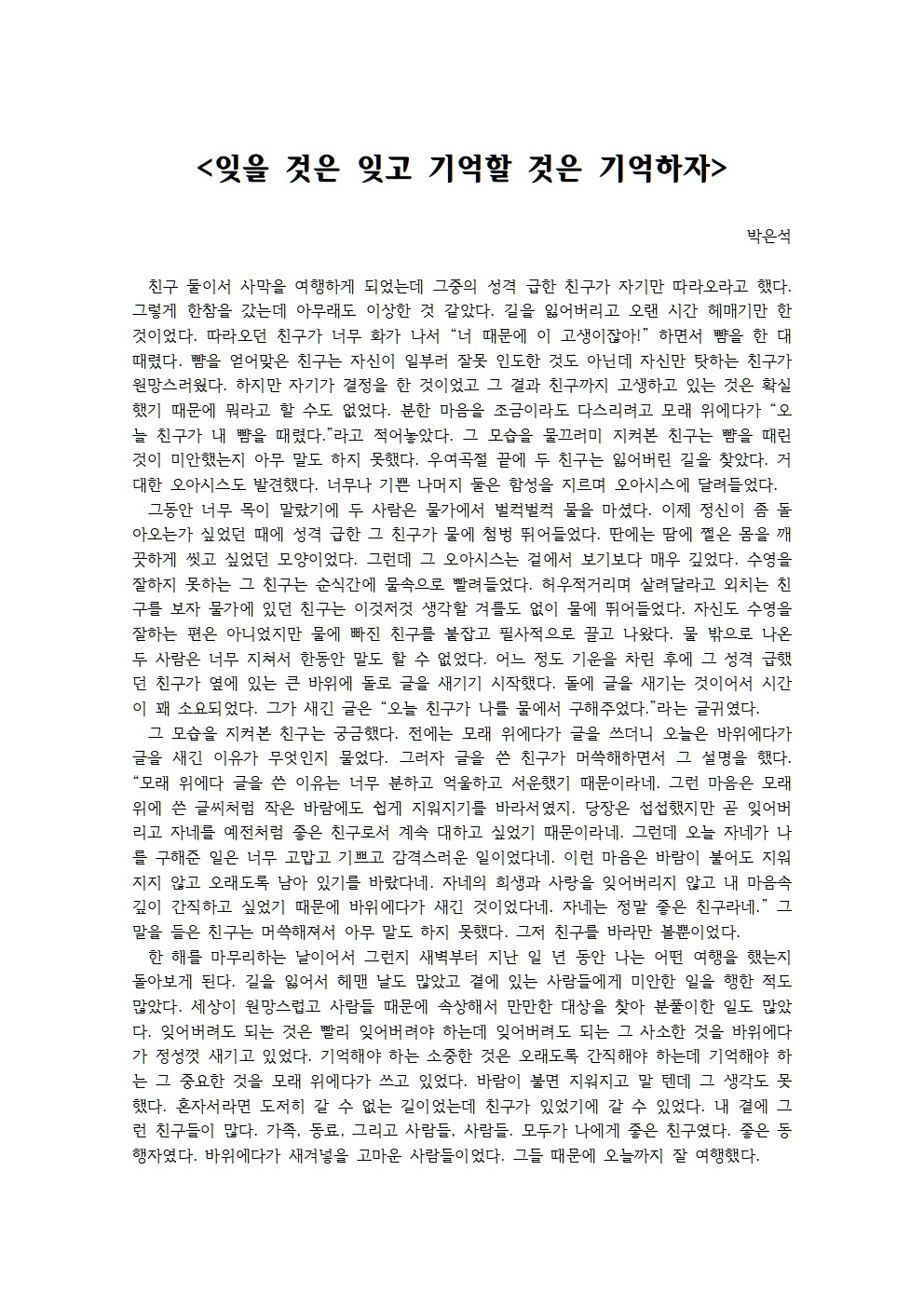 분한 마음을 조금이라도 다스리려고 모래 위에다가 “오늘 친구가 내 뺨을 때렸다.”라고 적어놓았다.