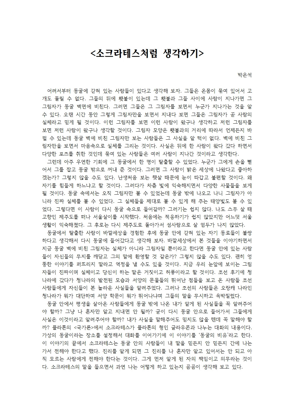 플라톤의 <국가>에서 소크라테스가 플라톤의 형인 글라우콘과 나누는 대화의 내용이다.