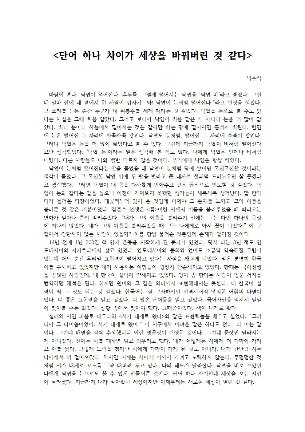 그런데 얼마 전에 내 곁에서 한 사람이 갑자기 “와! 낙엽이 눈처럼 떨어진다.”라고 탄성을 질렀다.