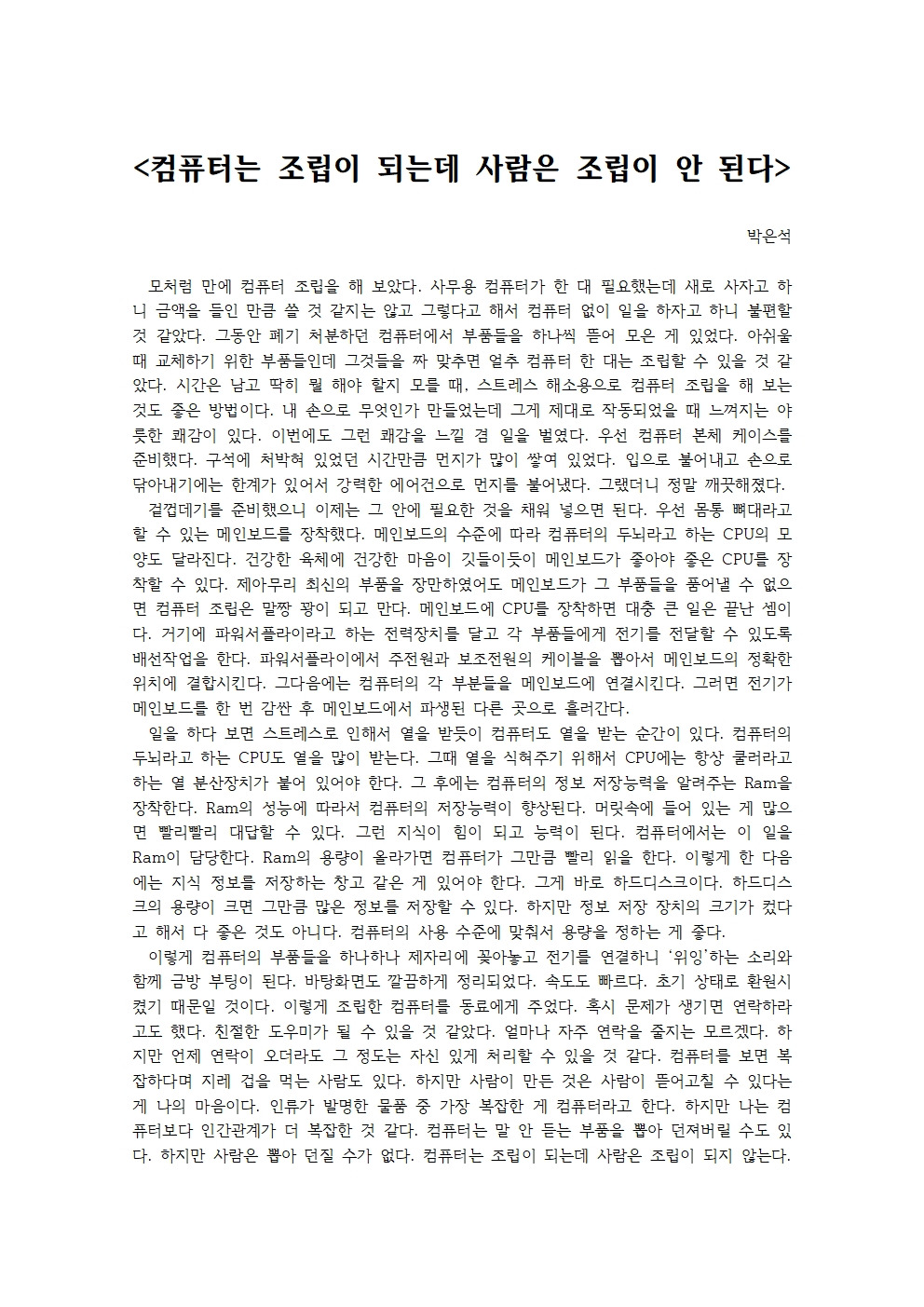이렇게 컴퓨터의 부품들을 하나하나 제자리에 꽂아놓고 전기를 연결하니 ‘위잉’하는 소리와 함께 금방 부팅이 된다. 바탕화면도 깔끔하게 정리되었다. 속도도 빠르다. 초기 상태로 환원시켰기 때문일 것이다. 이렇게 조립한 컴퓨터를 동료에게 주었다. 혹시 문제가 생기면 연락하라고도 했다. 친절한 도우미가 될 수 있을 것 같았다. 얼마나 자주 연락을 줄지는 모르겠다. 하지만 언제 연락이 오더라도 그 정도는 자신 있게 처리할 수 있을 것 같다. 컴퓨터를 보면 복잡하다며 지레 겁을 먹는 사람도 있다. 하지만 사람이 만든 것은 사람이 뜯어고칠 수 있다는 게 나의 마음이다. 인류가 발명한 물품 중 가장 복잡한 게 컴퓨터라고 한다. 하지만 나는 컴퓨터보다 인간관계가 더 복잡한 것 같다. 컴퓨터는 말 안 듣는 부품을 뽑아 던져버릴 수도 있다. 하지만 사람은 뽑아 던질 수가 없다. 컴퓨터는 조립이 되는데 사람은 조립이 되지 않는다.
