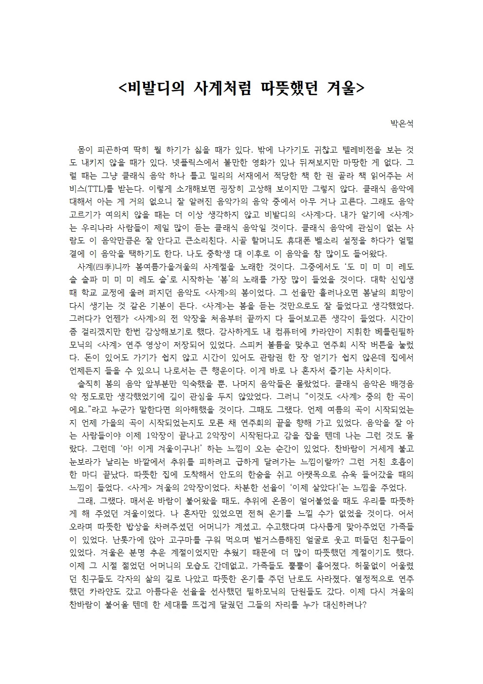 제1악장. 얼어붙을 듯이 차가운 겨울. 산과 들은 눈으로 뒤덮이고 바람은 나뭇가지를 잡아 흔든다. 이빨이 딱딱 부딪칠 정도로 추위가 극심하며 따뜻한 옷을 입으면서 시원한 음식을 먹는다. 제2