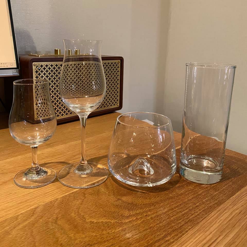 넓은 언더락잔도 무방하겠으나 가장 왼쪽에 있는 테이스팅 잔이 더 좋은데 와인 잔과 마찬가지로 향을 좀 더 모아서 잘 느끼도록 해 줍니다. 인터넷에서 ‘위스키 테이스팅 잔’이라고 검색하면 쉽게 찾을 수 있고 가격도 비싸지 않습니다. 흔히 ‘스트레이트 잔’이나 ‘샷 잔’이라고 부르는 작은 잔은 사실 한 입에 털어 넣을 목적이 아니라면 별로 권하고 싶지 않아요. 그 옆에 다리가 좀 긴 잔은 리델에서 나온 꼬냑 잔인데 저는 위스키 마실 때도 애용합니다. 사실 테이스팅 잔과 실질적으로 다를 것은 없는데 그냥 좀 허세죠. 언제나 폼은 중요합니다.