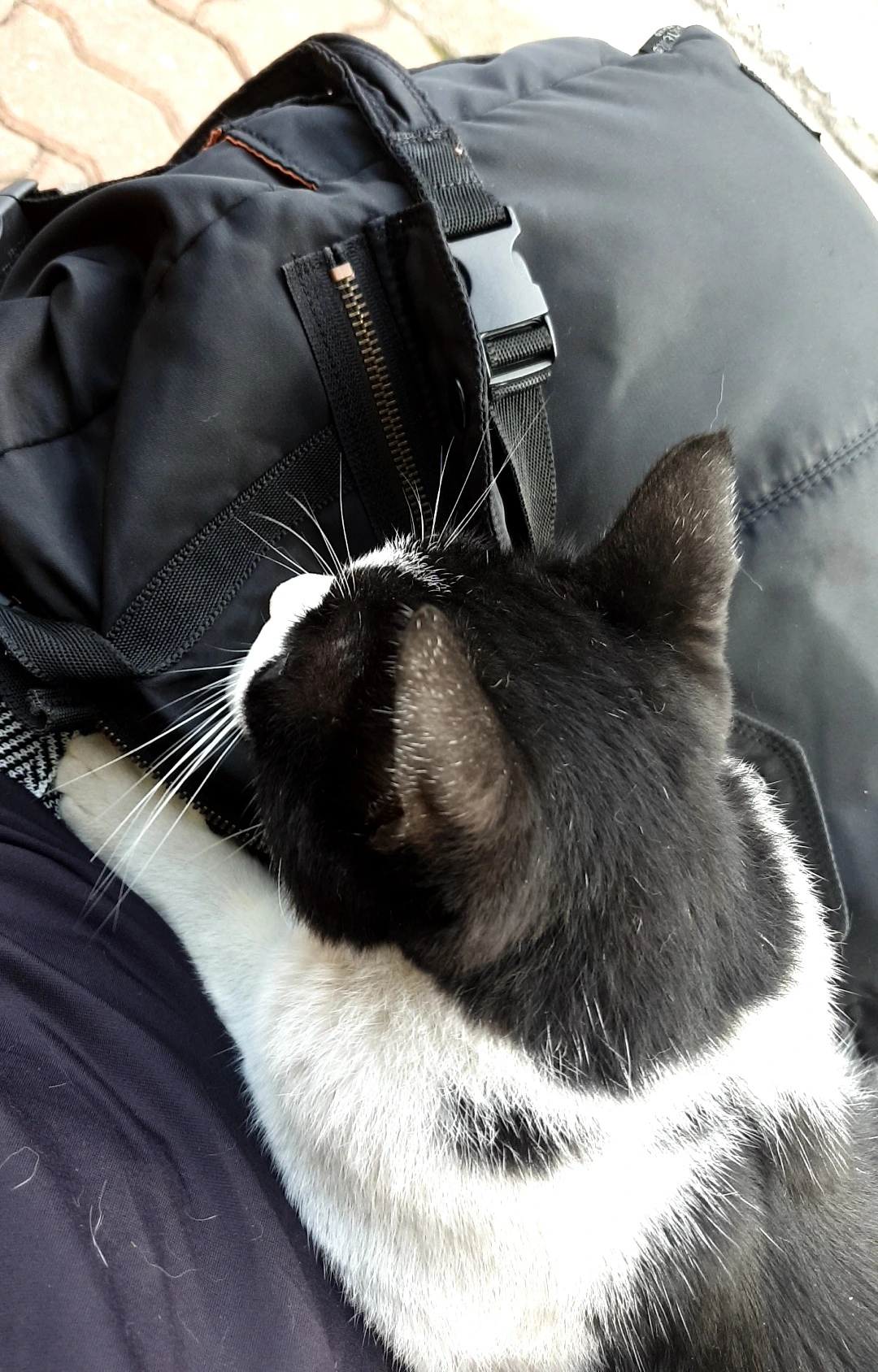 본인보다 큰 고양이를 본 뽕이는 얼른 내 등뒤에 붙어 숨어버렸다.