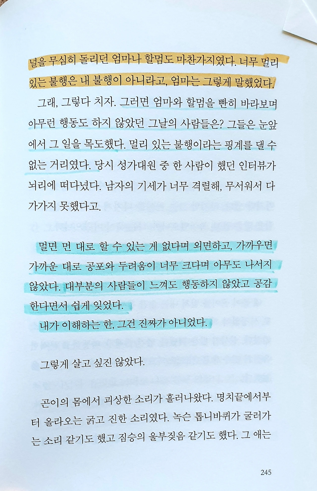 "멀면 먼 대로 할 수 있는 게 없다며 외면하고, 가까우면 가까운 대로 공포와 두려움이 너무 크다며 아무도 나서지 않았다. 대부분의 사람들이 느껴도 행동하지 않았고 공감한다면서 쉽게 잊었다.