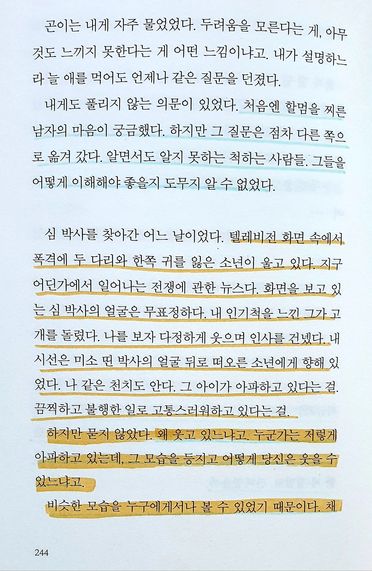 그리고 역설적이게도 뉴스 화면 속 전쟁 폐허 더미 안에서 처절하게 울고 있는 아이들의 모습은 별 감흥 없이 본다. 실제 일어난 비극임에도 오늘의 뉴스 중 이슈 거리로 옆 사람과 웃으며 이야기를 나눈다. 모든 감정을 머리로 이해해야 하는 선재는 이런 '정상인의 사람들'을 도저히 이해가지 못한다.