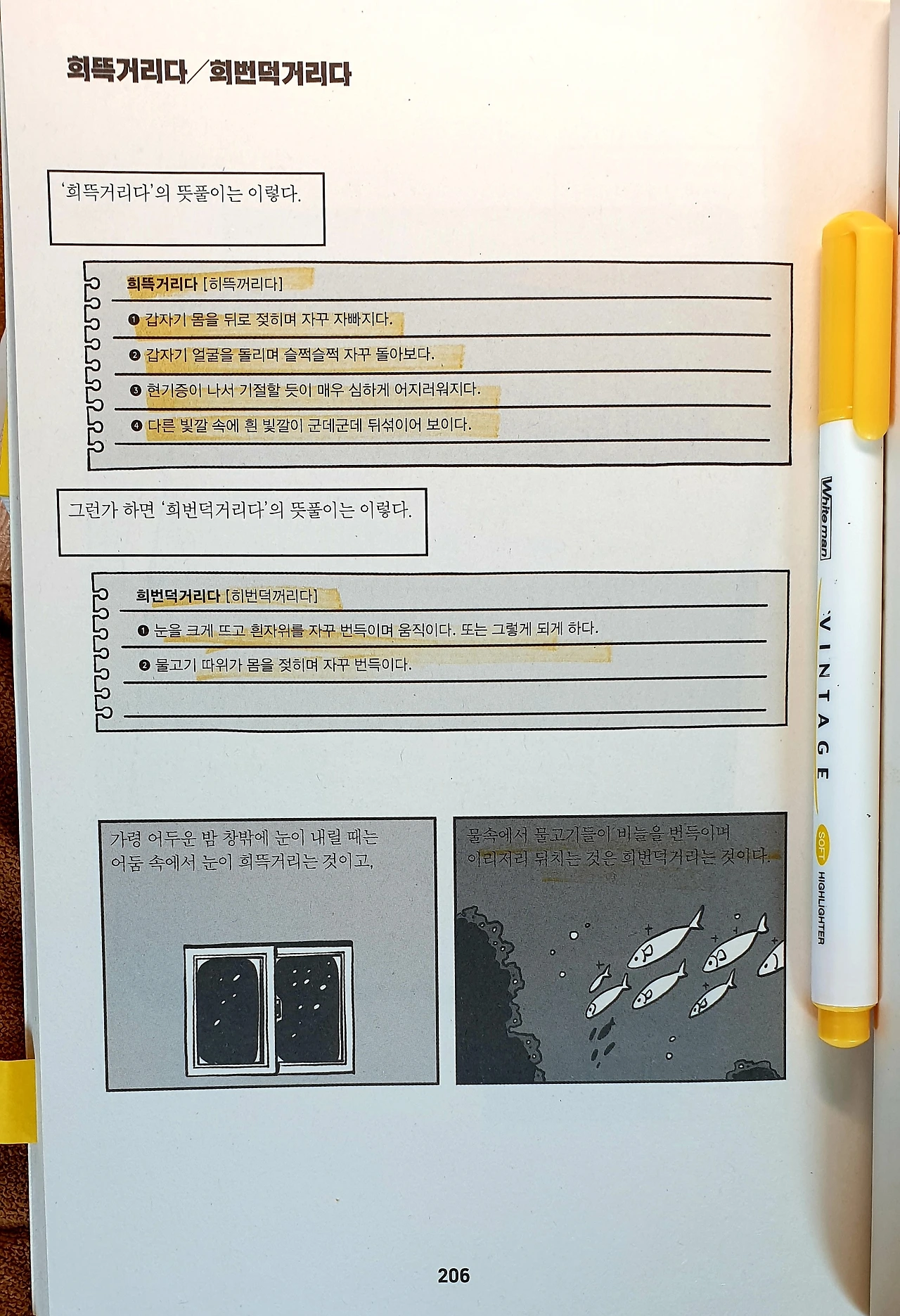 그래서 만화 '동사의 맛'이라는 책을 읽었다. 만화로 되어 있어 한 권 읽는데 1시간도 걸리지 않았다. 이 책을 읽으면서 '희뜩거리다'와 '희번덕거리다' 등의 비슷하지만 다른 의미의 단어들과 그 예를 알게 되었다. 책 한 권에 비해 어휘 관련 정보가 많지 않아 아쉬운 점이 있었지만('내돈내산'이라 좀 더 많이 배우고 싶었나 보다) 이 책을 통해 하나 느낀 점이 있다. 이제부턴 국어사전을 자주 찾아보자라는 결심!