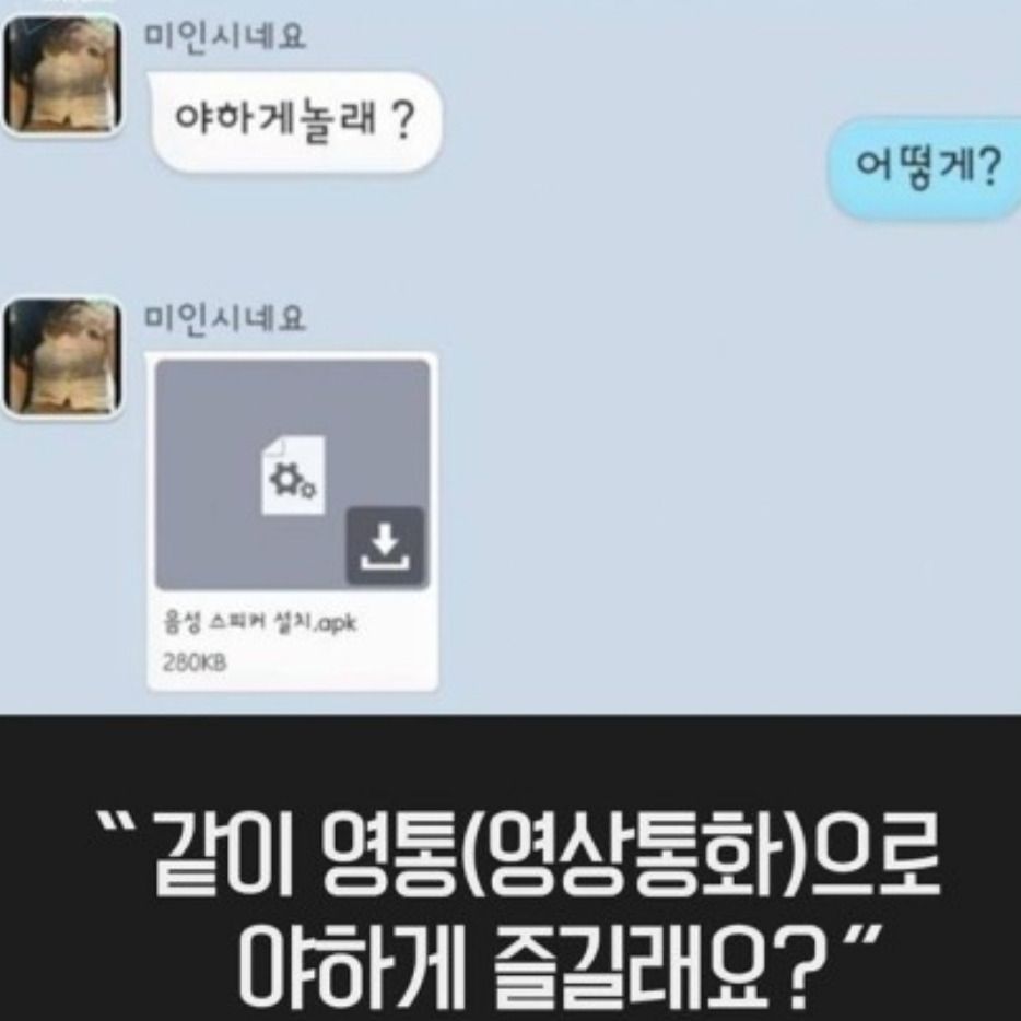 페이스북 메시지를 하던 중 한 여자가 말을 걸어왔고, 17년 차 모태솔로 영민이는 그 여자의 예쁜 외모에 마음이 설레였다고 한다. 며칠 전에 그녀가 화상채팅을 하자고 갑자기 제안을 해왔고 결국 화상채팅을 하게 되면서 대화의 수위는 점점 야한 방향으로 올라갔단다. 그러던 중 앱 하나를 핸드폰에 설치하면 더욱 생생하게(?) 화상채팅을 할 수 있다는 그녀의 제안에 혹하여 보내준 URL로 앱을 깔았는데 그때부터 영민이의 말과 행동이 녹화되었고 핸드폰에 저장되어있던 모든 개인 정보도 유출된 것 같다고 했다.