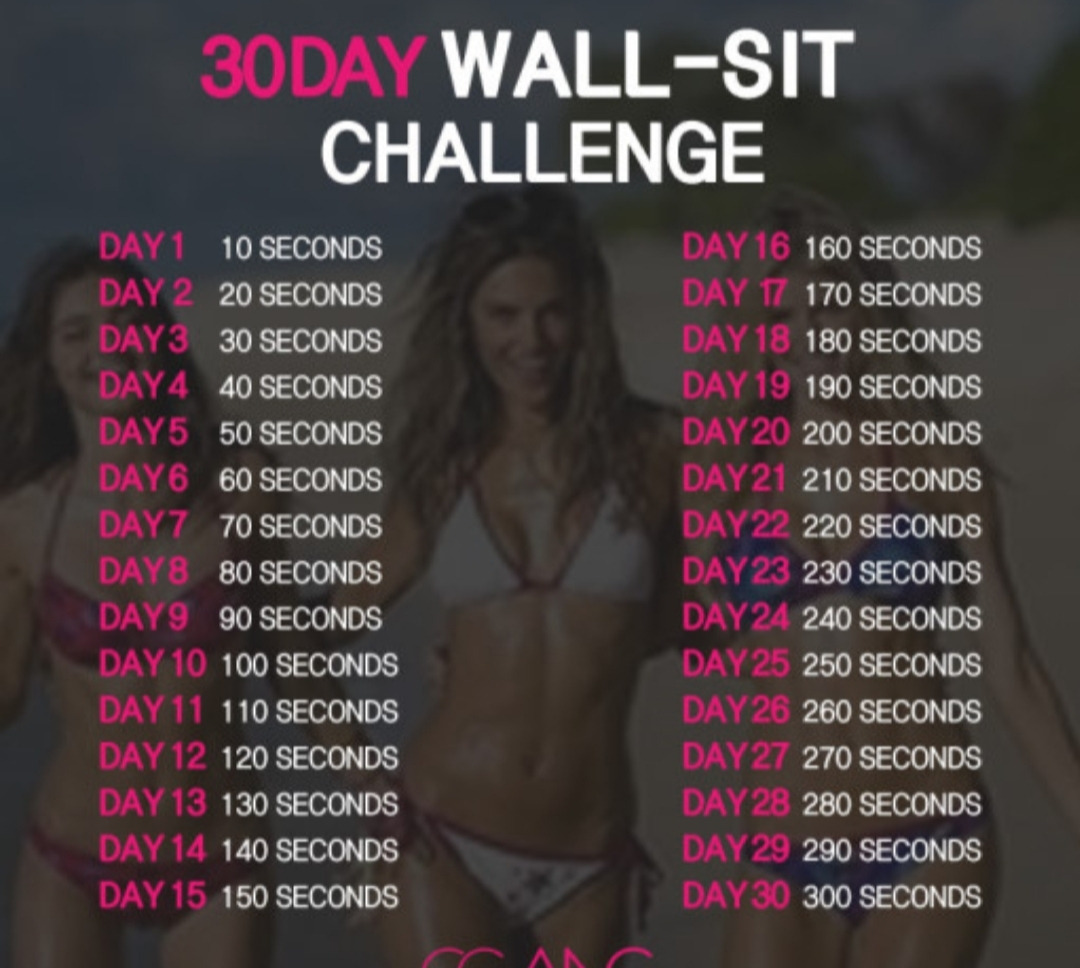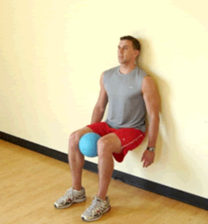 머리부터 엉덩이까지 벽에 기대고 무릎이 직각이 되도록 굽힌다. 이때 무릎이 발끝을 넘어가면 안된다.