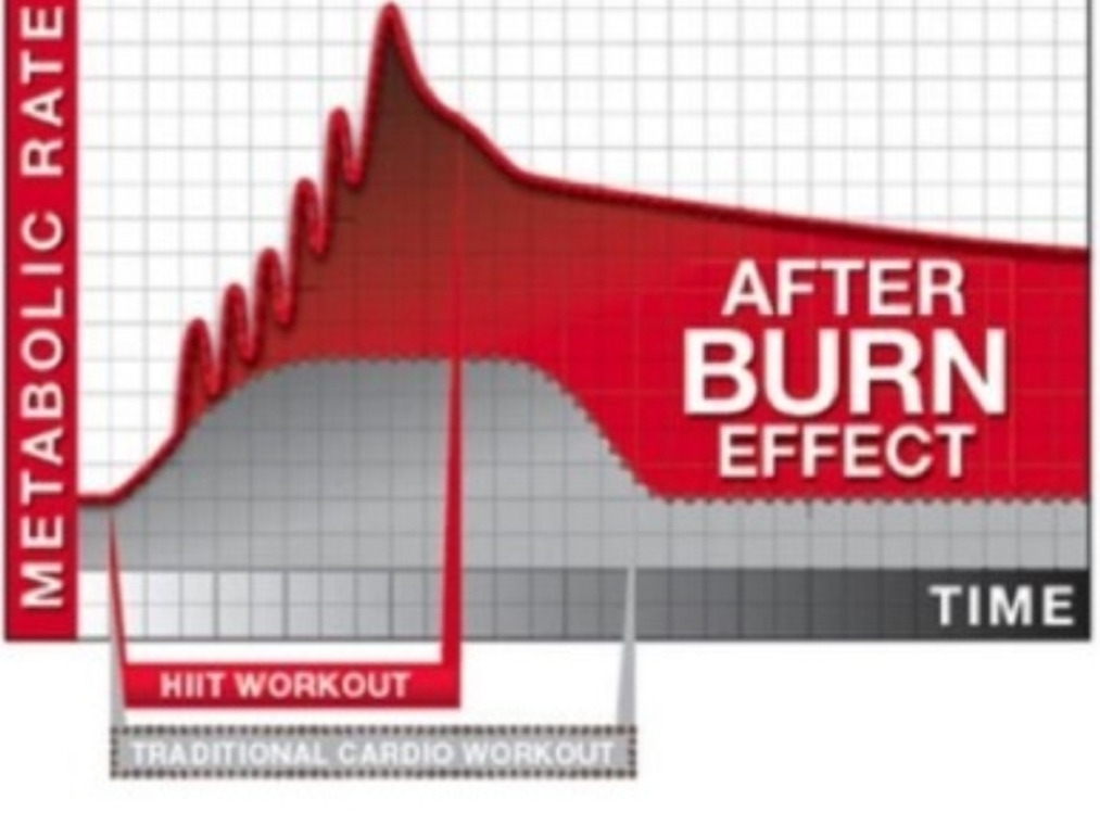 고강도 인터벌 운동(HIIT)에서는 자신의 호흡량 이상으로 에너지가 필요하기 때문에 산소부족 현상으로 운동 후의 산소 소모량 증가가 일어남. 따라서 운동 중에도 에너지가 소비되지만 운동 후 휴식기(회복기) 중에도 산소를 더 소비하게 되므로 칼로리가 지속적으로 소비되어 체지방이 감량에효율적임.