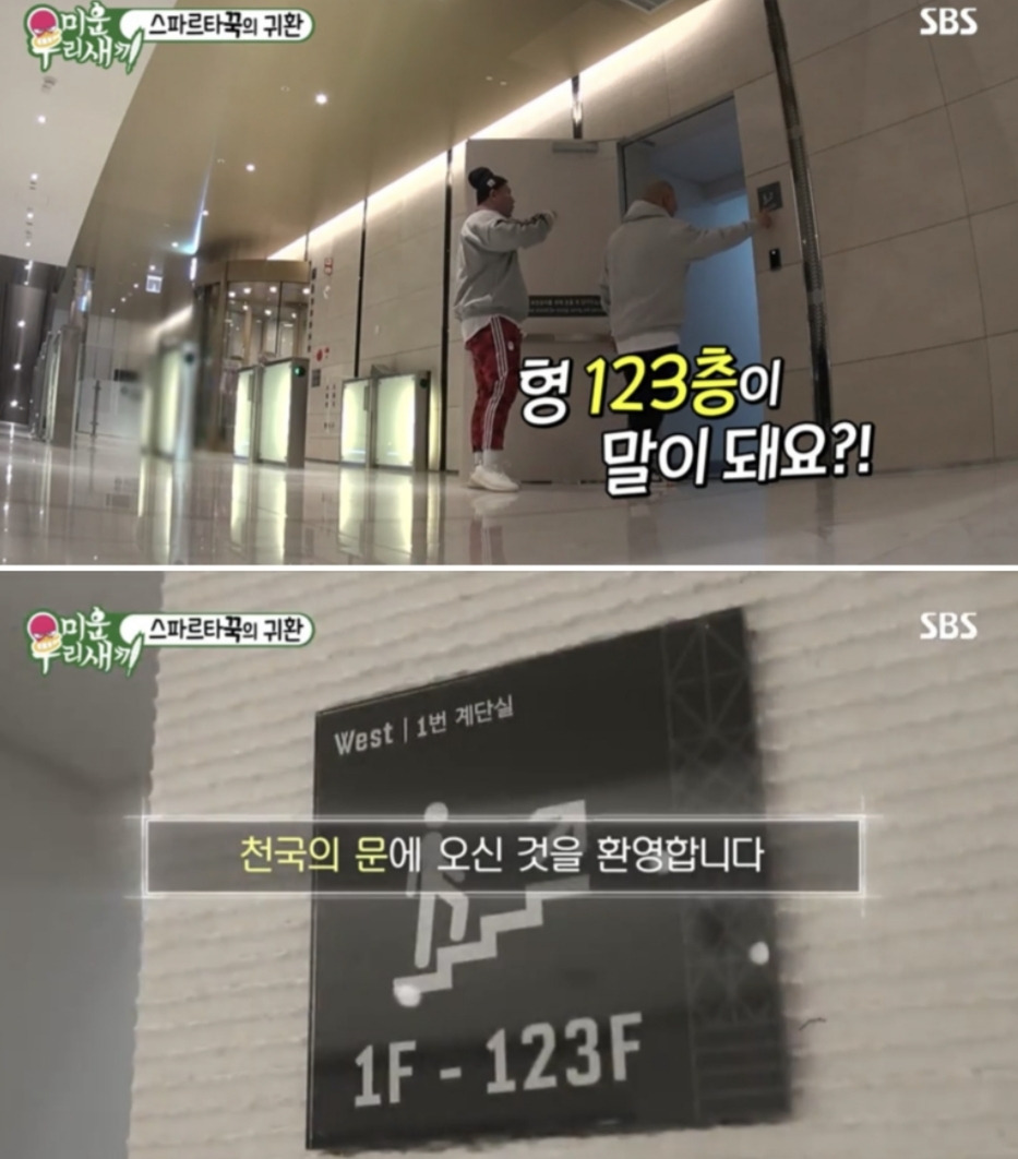 김종국씨가 100Kg이 넘는 동생들과 롯데타워 123층 전망대까지 계단을 오르는 장면이었다. 평소에도 계단 오르기 운동을 즐겨한다는 김종국은 동생들을 이끌고 40분을 목표로 롯데타워 꼭대기까지 오르는 내용이었다.