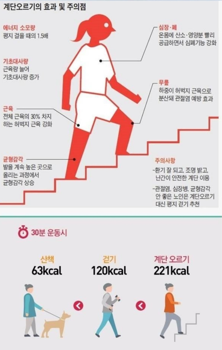 (60kg 사람 기준 30분 걷기는 63칼로리가 소모되는 반면, 60kg 사람 기준 30분 계단 오르기는 220칼로리 소모)