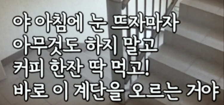 그 날 저녁 아파트 1층에 있는 음식 쓰레기 수거함에 음식물 찌꺼기를 버리고 집으로 들어가기 위해(우리 집은 11층이다) 엘리베이터를 기다리고 있었다. 불현듯 예전 텔레비젼 한 프로그램에서 봤던 가수 김종국의 계단오르기 장면이 떠올랐다.