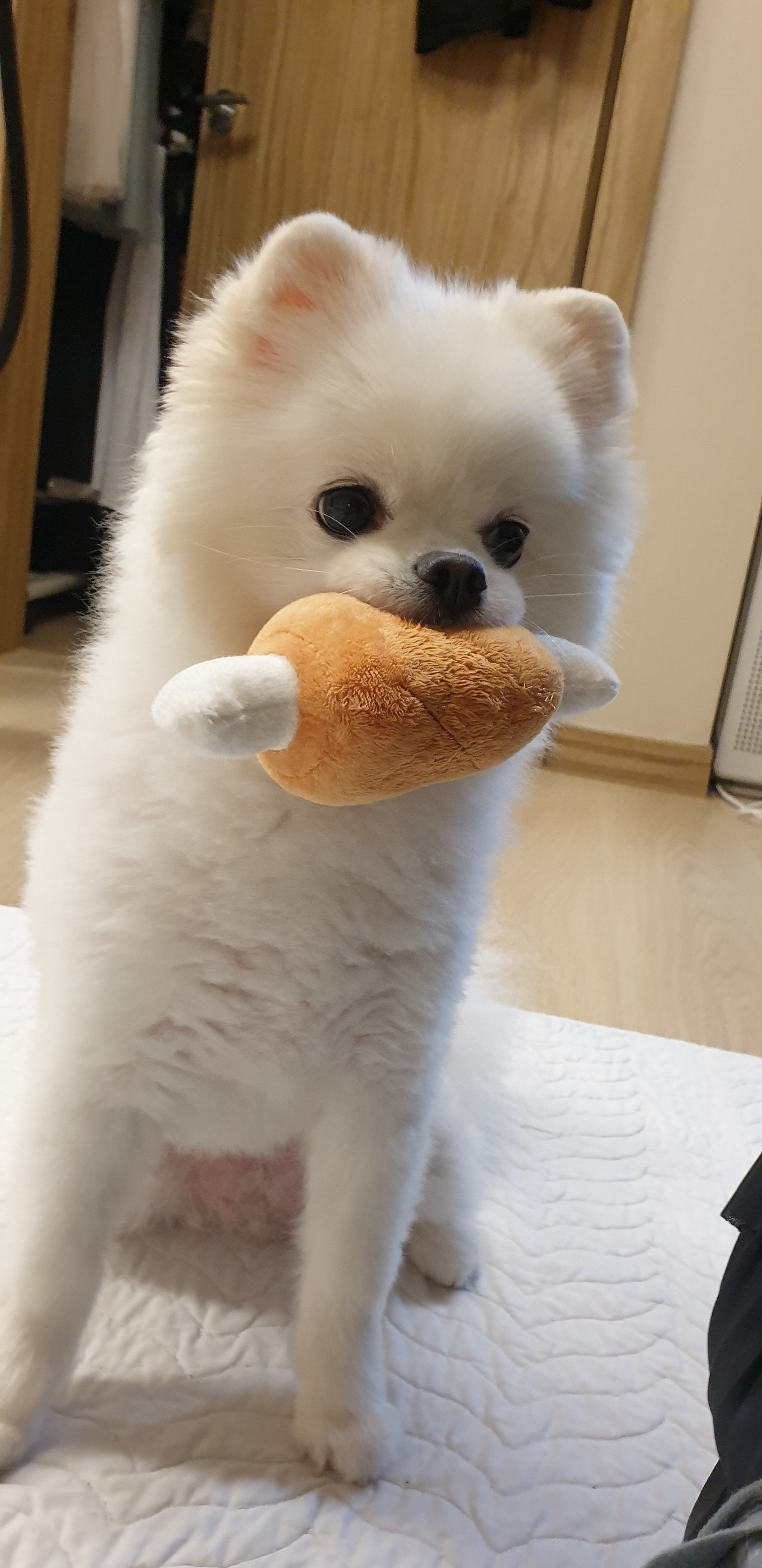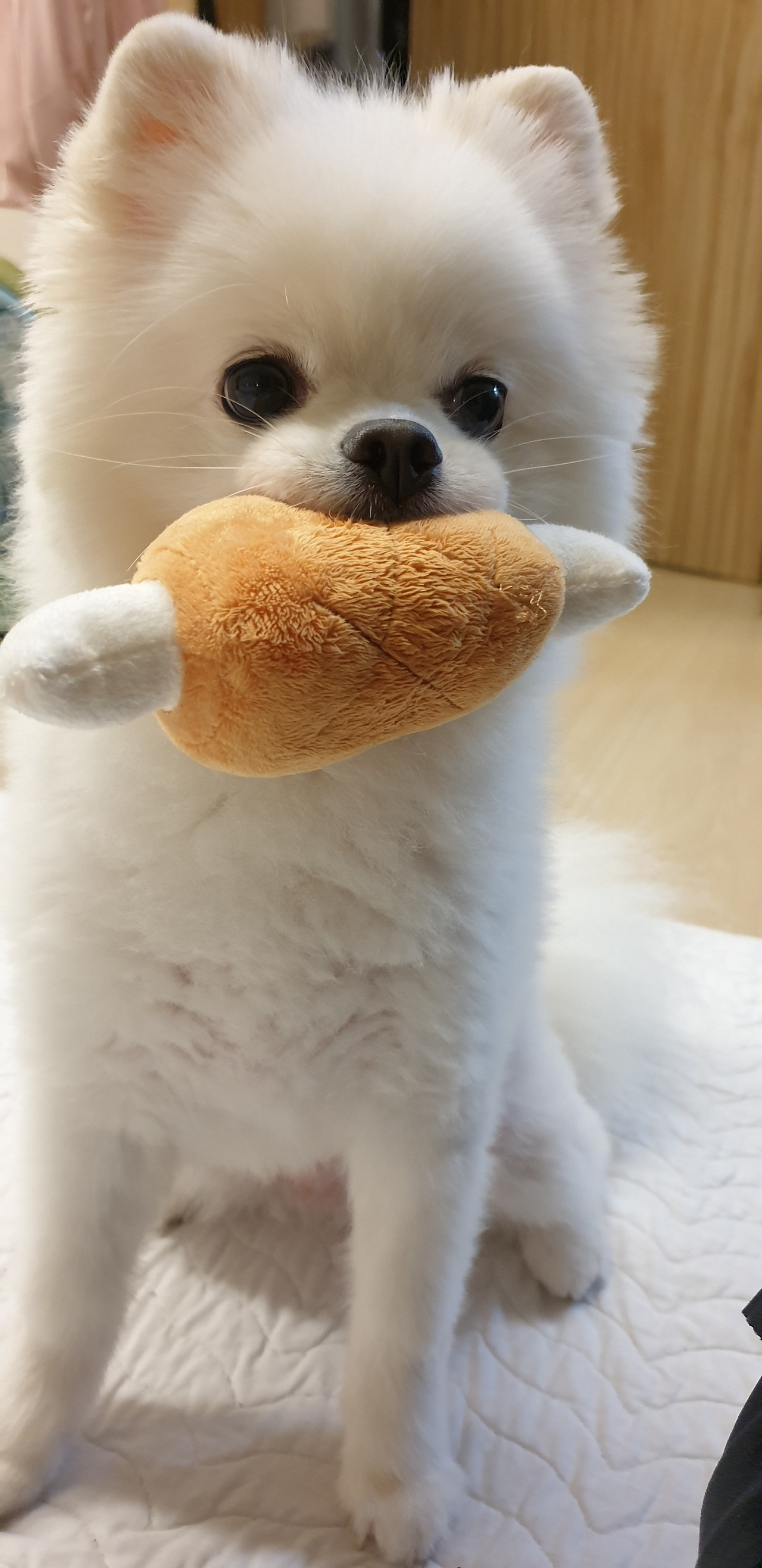 닭다리 모양의 새로운 삑삑이 인형을 보고선 자기꺼라며 콧물을 튀기며 "앙앙!!!" 거리고 짖는다.