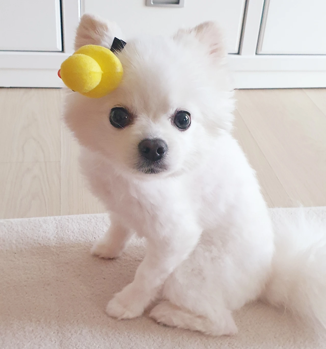ㅡ 머리숱만 유난히 없는 뽕이 씨를 위해 집사가 살짝 핀으로 장식시켜 드렸더니, 눈으로 온갖 욕을 하며 "좋은 말 할 때 삔 빨리 빼라!!! 집사놈아, 싸우자!!!"