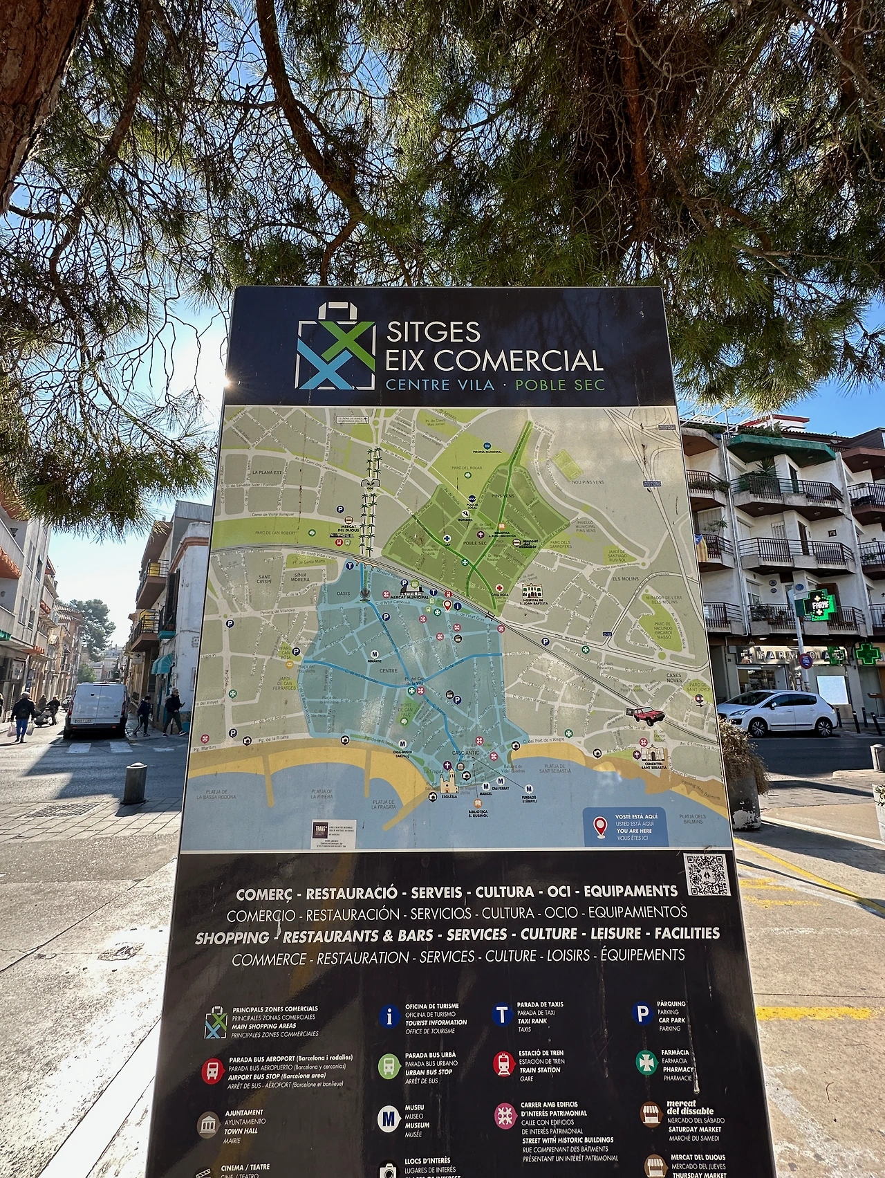 허름한 기차역에는 시제스(Sitges)라고 쓰인 팻말이 덩그러니 있다. 이곳은 바르셀로나와 다르게 고요하고 잔잔하다. 혼자 남겨진 나는 지도가 그려진 안내판 앞에 멈춰 선다. 길쭉하게 뻗은 솔잎이 지도 아래 그림자를 드리우고, 햇빛은 반짝 빛을 낸다. 나는 구글맵을 켜지 않고 해변을 향해 아래쪽으로 걷기 시작한다.