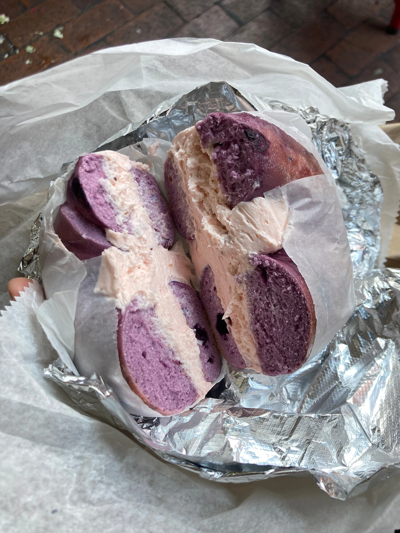 나는 그 뒤로 베이글 집에 한번 더 갔다. 좋아하는 블루베리가 들어간 베이글과 딸기 크림치즈를 골랐다. 연어 베이글보다 2.5배 정도 저렴했던 것 같은데 빵도 정말 쫀득하고 적당히 쫀쫀하고 꾸덕한 크림치즈가 물리지도 않는 게 정말 맛있었다. 포장한 베이글을 거리에서 먹었다. 파란 하늘과 핑크색 베이글의 만남. 마지막 한 입 남은 베이글을 하늘을 향해 들어 색을 음미한 다음 입으로 쏙 넣었다.