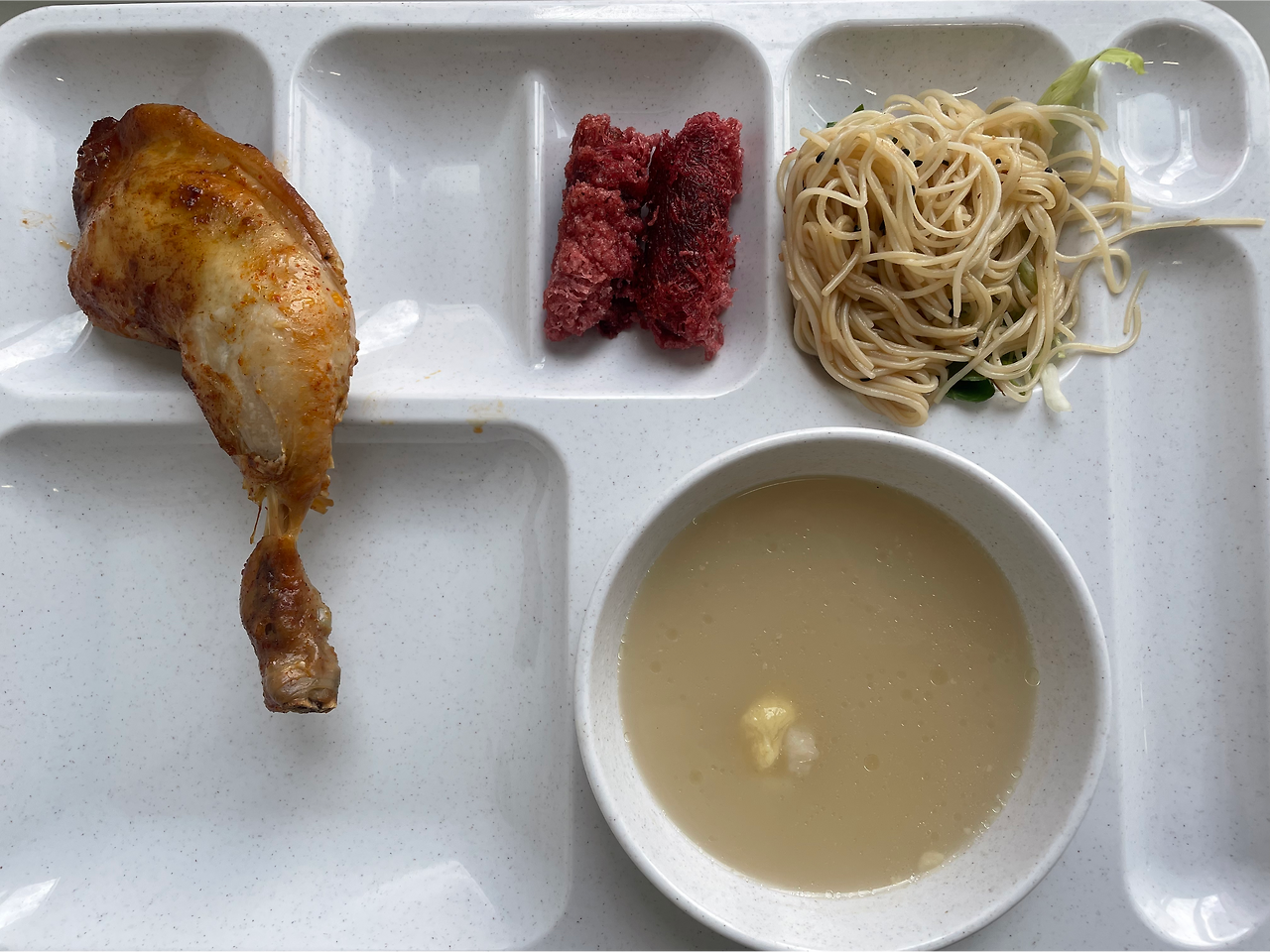 4. 점심 12시: 도가니탕 1/2팩+닭다리구이+고구마롤튀김 1개+쌀국수면 샐러드 소량, 고기가 들어가니까 정말 힘이 나는 기분ㅠㅠ고구마롤튀김도 달다구리 해서 랜만에 간식 먹는 듯했다