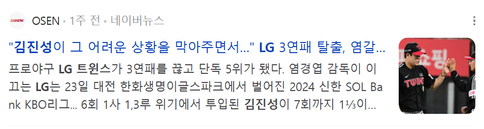 5월 31일 두산과의 경기 직관 때 김진성의 모습도 잊을 수 없다. 6회 1사 1, 2루 위기 상황에서 다섯 타자 연속 범타(*타자가 친 공이 수비에 잡혀 아웃 처리)시키며 LG의 승리를 지켰다. 김진성이 내려올 때 모든 팬들이 이름을 외쳤다. 그는 이번에도 한결같이 고개를 숙이고 무거운 표정으로 더그아웃으로 향했다. 그 모습마저 김진성 답다.