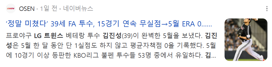 한점차 상황에서 올라와 호투를 보여준 5월 23일 인터뷰에선 선수로서 생명이 얼마 안 남아 하루살이처럼 피칭하고 있다고 말했다. 개인적인 목표는 없고 팀을 위해 몸을 바치겠다고, 하루하루 최선을 다해서 열심히 하고 있다고 했다. 일종의 존경심, 그리고 어딘가 짠한 마음이 든다.
