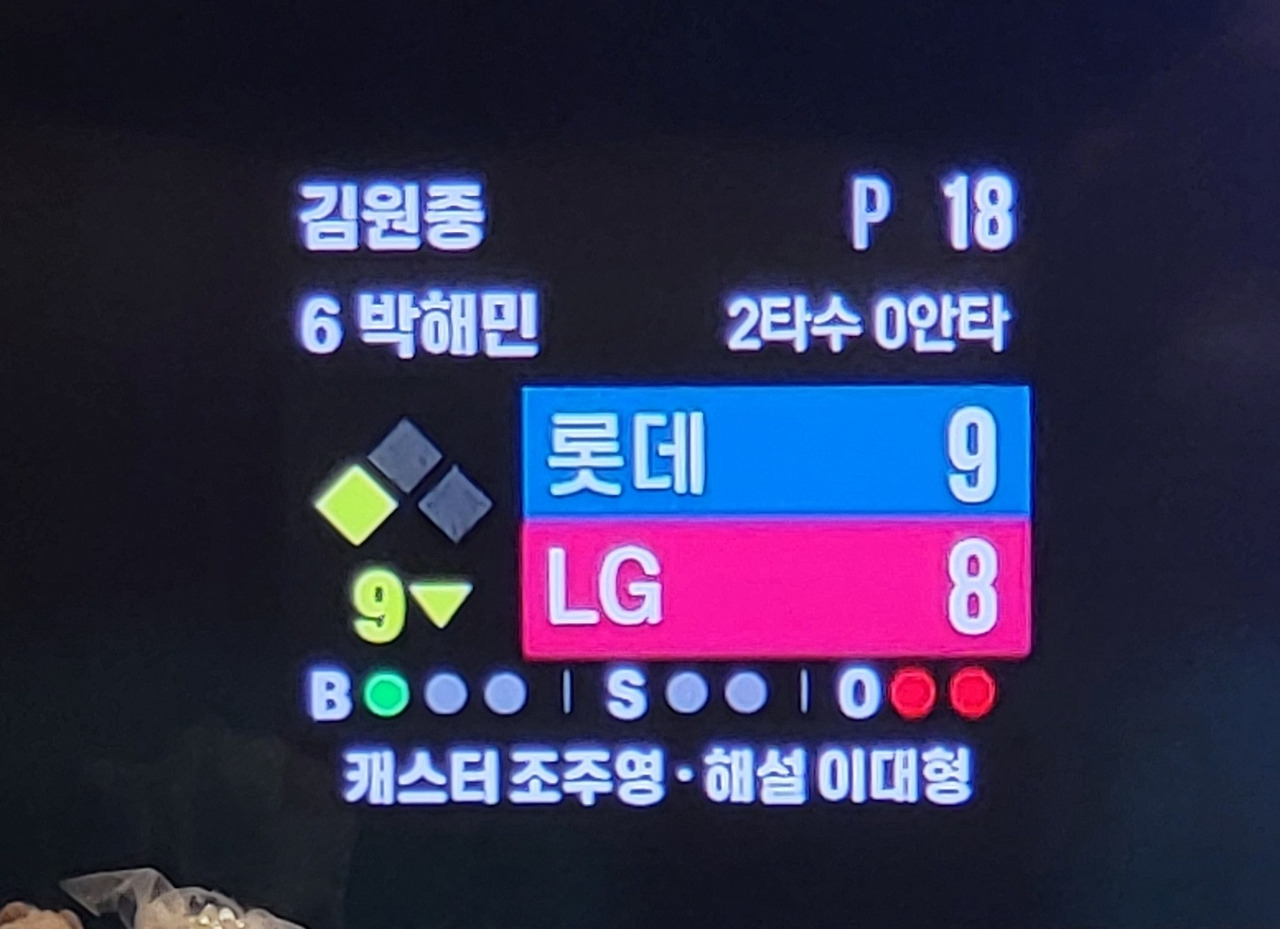 선취점을 먼저 뽑은 건 롯데였다. 하지만 LG가 1회 말 2대1로 역전했다. 2회는 양 팀 다 실점과 득점이 없었고, 3회 초엔 롯데가 다시 2대2 동점을 만들었다. 4회 말엔 3대3이 됐다. 5회 말에 LG가 4대3으로 앞서가더니 6회 초엔 롯데가 2점을 내며 4대5가 된다. 7회엔 다시 7대6으로 LG가 앞섰다. 쇼파 위에서도 차분하게 볼 수가 없어서 난 아직 야구 멘탈이 되긴 멀었구나 했는데, 오랜 롯데 팬인 친한 회사 선배의 대혼란이 느껴지는 카톡을 받고 야구는 오래 본 사람도 차분할 수 없다는 걸 깨달았다.
