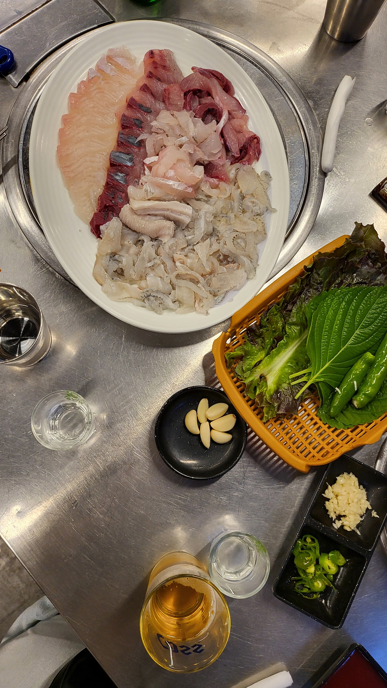 그리곤 저녁 약속을 잡았다. 남편 친구와 셋이 회를 먹기로 했다. 창원 사람인 그가 잘 아는 맛집이 있다고 했다. 다섯 시에 식당에서 만났다. 2층 규모의 식당은 매우 컸고, 음식도 맛있었다. 처음으로 창원에 와서 남편의 오랜 친구를 만나고, 함께 술 한 잔 하는 시간이 소중하게 느껴졌다. 늦은 밤 다시 빗속을 뚫고 숙소로 돌아왔다.