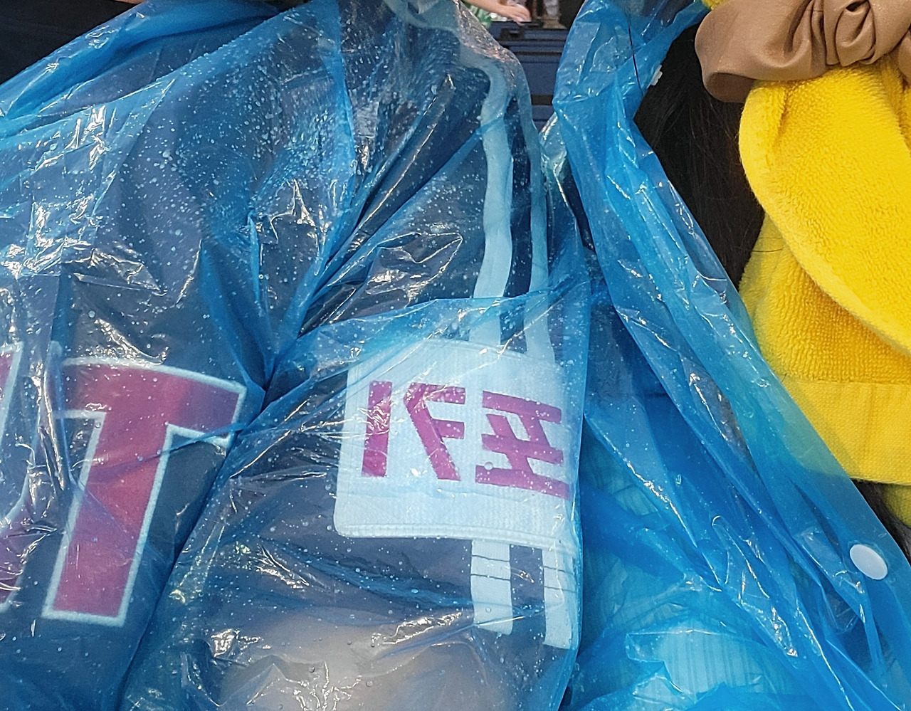 경기는 취소되지 않았다. 이기든 지든 한 경기 더 보고 갈 수 있다는 것 자체가 좋았다. 중간에 빗방울이 내리기도, 일시적으로 소나기가 쏟아지기도 해 남편이 우비를 사 와 입었다. 결과적으로 경기는 끝까지 했고, 이겼다. 밤 9시까지 마산역을 늦지 않게 가야 했기에 9회 초까지만 보고 먼저 나왔지만, 그대로 더 실점하지 않았다. 만약 낮 1시 기차를 타고 떠났다면 못 느꼈을 직관의 즐거움이었다.