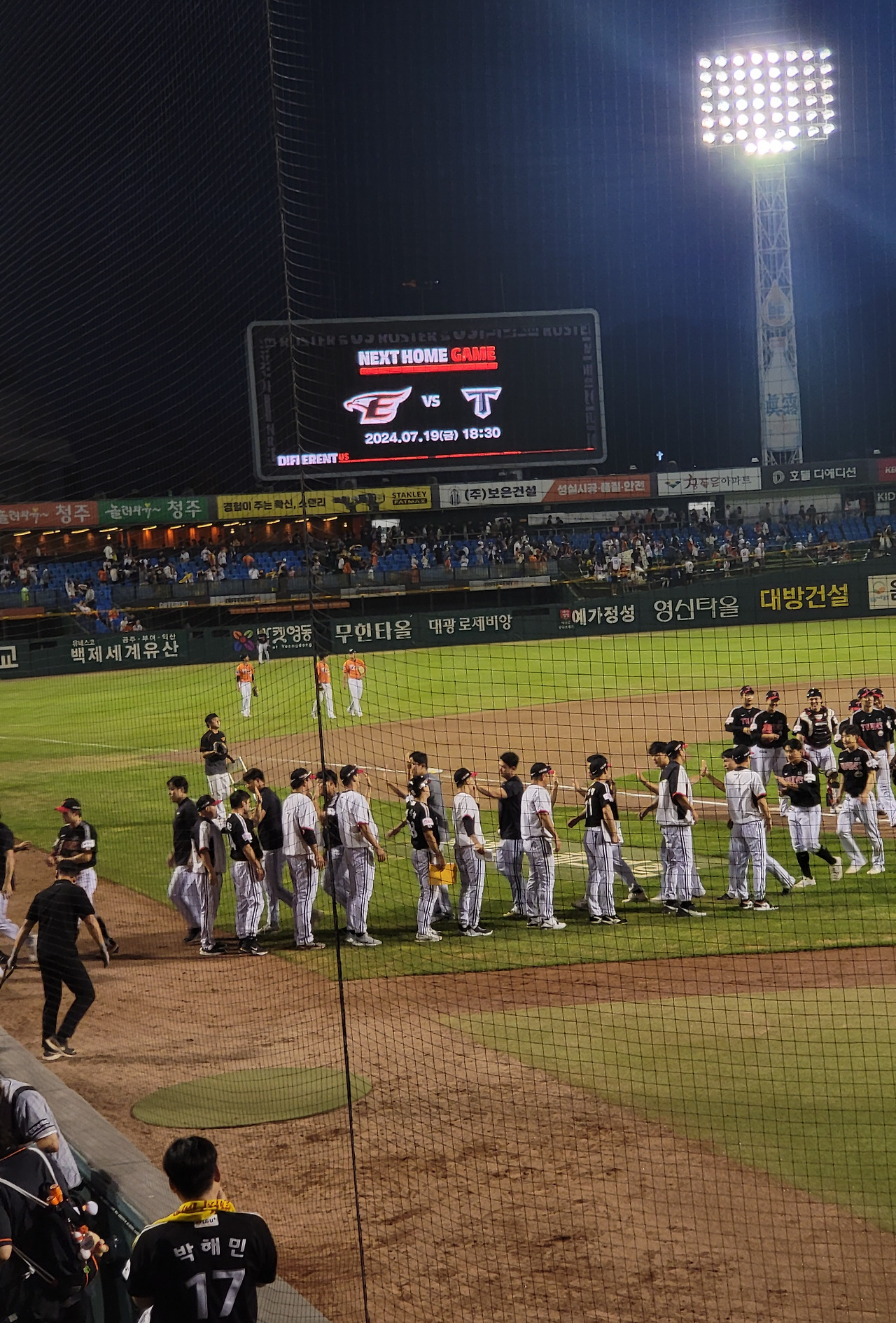 온통 주황 깃발이 걸린 이글스파크에 내려 티켓을 바꾸고 일찍이 입장해 자리에 앉았다. 덕아웃과 경기장이 코앞에서 보이는 거리였다. 몸 푸는 양 팀 선수들의 모습이 너무 가까이 보여 잠시 비현실적이란 생각까지 했다. 덥고 습한 날씨지만 간간이 바람이 불어 버틸만했고, 드넓은 야구장에 앉아 경기를 기다리는 시간이 역시 행복했다. 야구는 집에서 보는 게 여러모로 편하고 절약되고 각종 정보값도 빠르게 이해되지만, 결국 직관을 하고 또 하고 싶은 이유가 여기에 있다. 이번 대전은 올 시즌 스물한 번째 직관이었다.