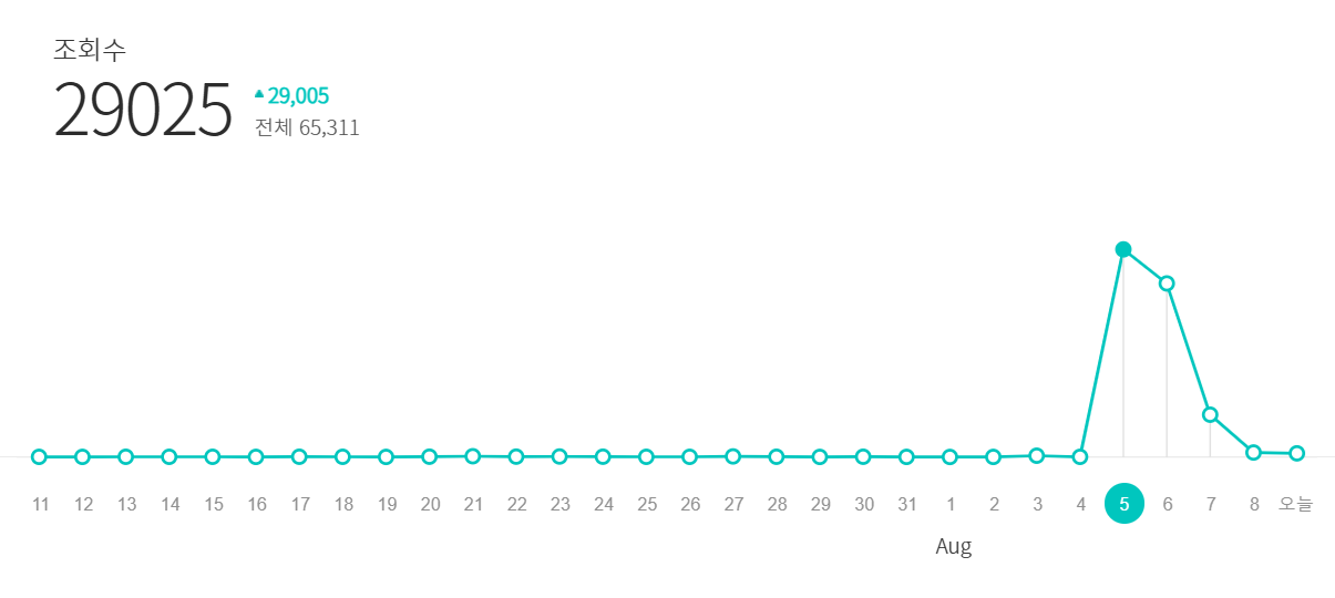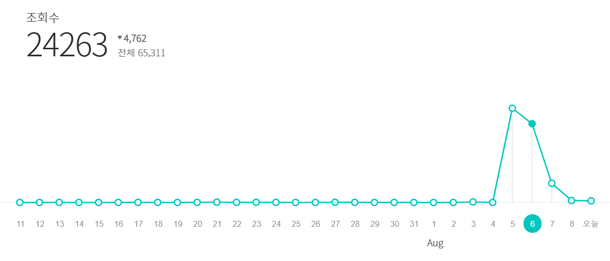 결과적으로 이날 하루 조회수는 29025회까지 올랐다. 새삼 커다란 숫자 옆에 쓰여있는 ▲29,005가 무거워 보여 귀엽다. 전날 조회수는 20이었단 얘기다. 바람 한 점 불지 않는 호수처럼 잔잔했던 나의 브런치스토리 그래프가 8월 5일 처음 큰 파도를 맞았다. 하루짜리 놀라운 경험인가 했는데 다음 날도 24263회까지 올랐다. 이틀 동안 하나의 글이 5만 회 이상 클릭된 거다.