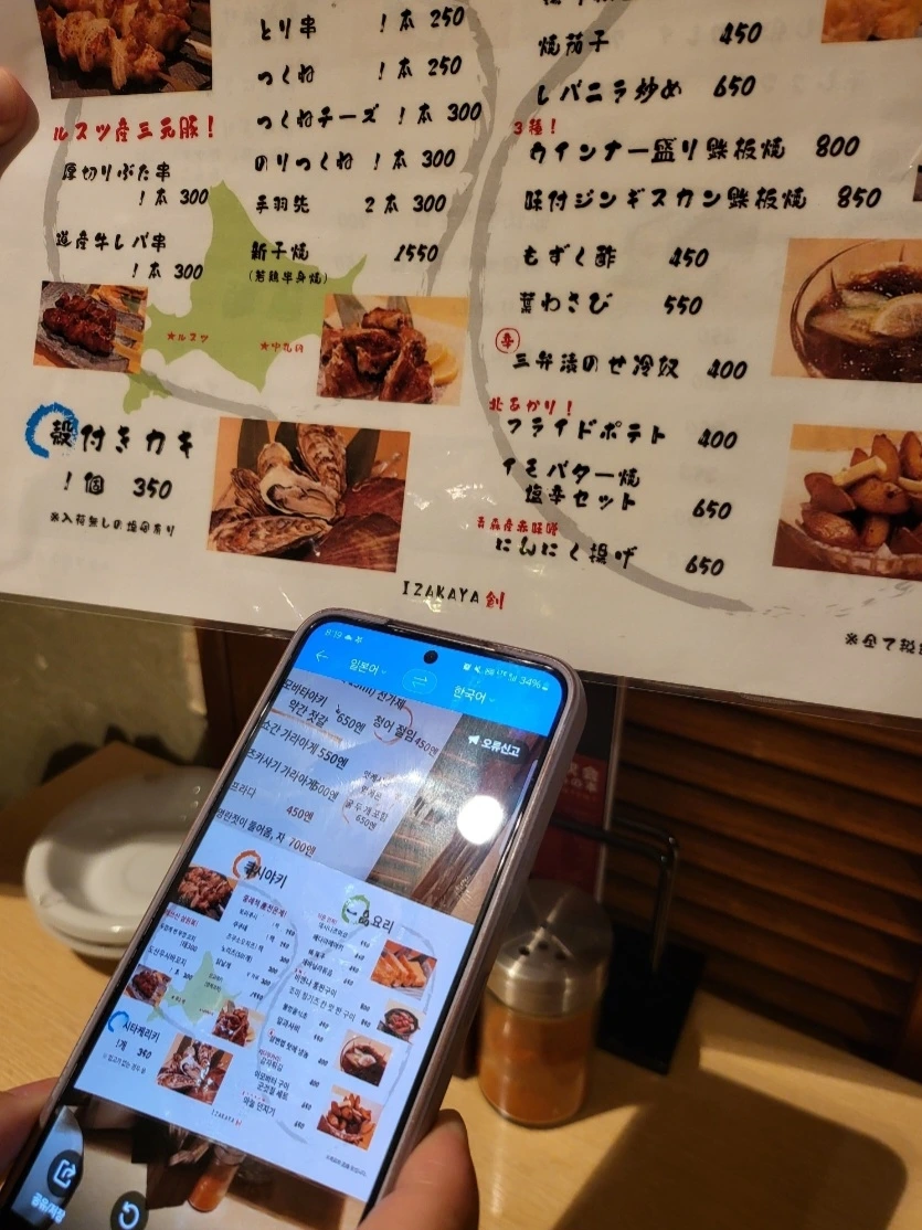 우리는 안쪽 테이블에 앉았다. 양고기를 일부러 적게 먹고 왔기에 맛있어 보이는 음식을 다양하게 시켰다. 둘 다 일본어는 한 마디도 못하지만 파파고가 있으니 두려울 건 없다. 나는 삿포로 생맥주, 남편은 이름 모를 사케도 주문했다.