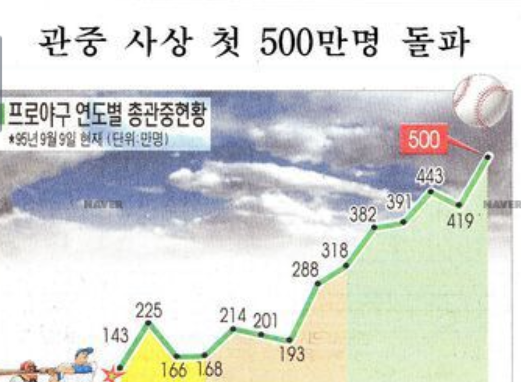1995년 9월 11일 조선일보_출처 네이버 뉴스라이브러리'지난해에 비해 관중이 가장 많이 늘어난 구단은 롯데. 막판 프로야구를 흥미롭게 만들고 있는 상승세 롯데는 1백10만 2천여 명이 구장을 찾아 지난해 61만 2천여 명보다 80%나 늘었다.' 이때 롯데는 준우승을 했다.