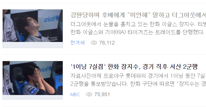 한화 장지수 선수에 관한 기사가 계속 이어지고 있다.