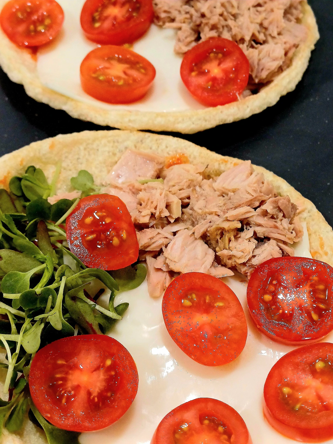 바삭바삭한 뻥튀기 위 건강한 토핑들을 가-득