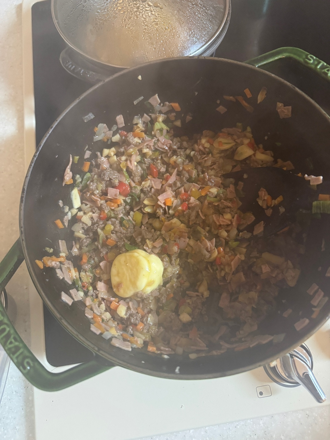 4. 볶은 고기, 야채에 버터 한 덩이 넣어서 녹여준다.