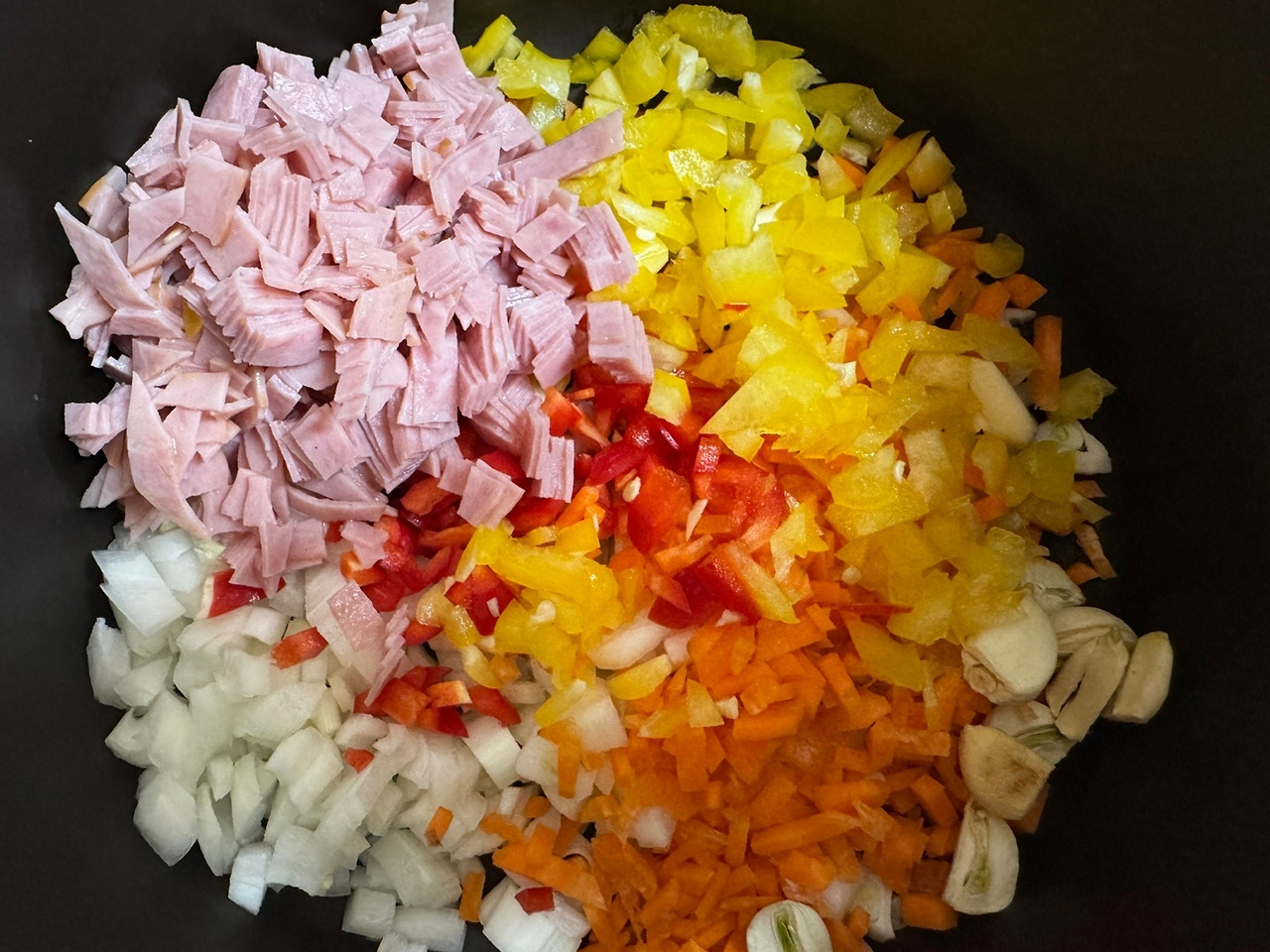 양파, 당근, 마늘, 샐러리(없어서 생략함), 베이컨 (햄대체), 각종야채(냉장고 털어서 파프리카 당첨), 소고기 간 것, 화이트와인, 소금, 후추, 월계수잎, 토마토소스(페이스트, 퓌레, 토마토소스 가능), 버터, 올리브유