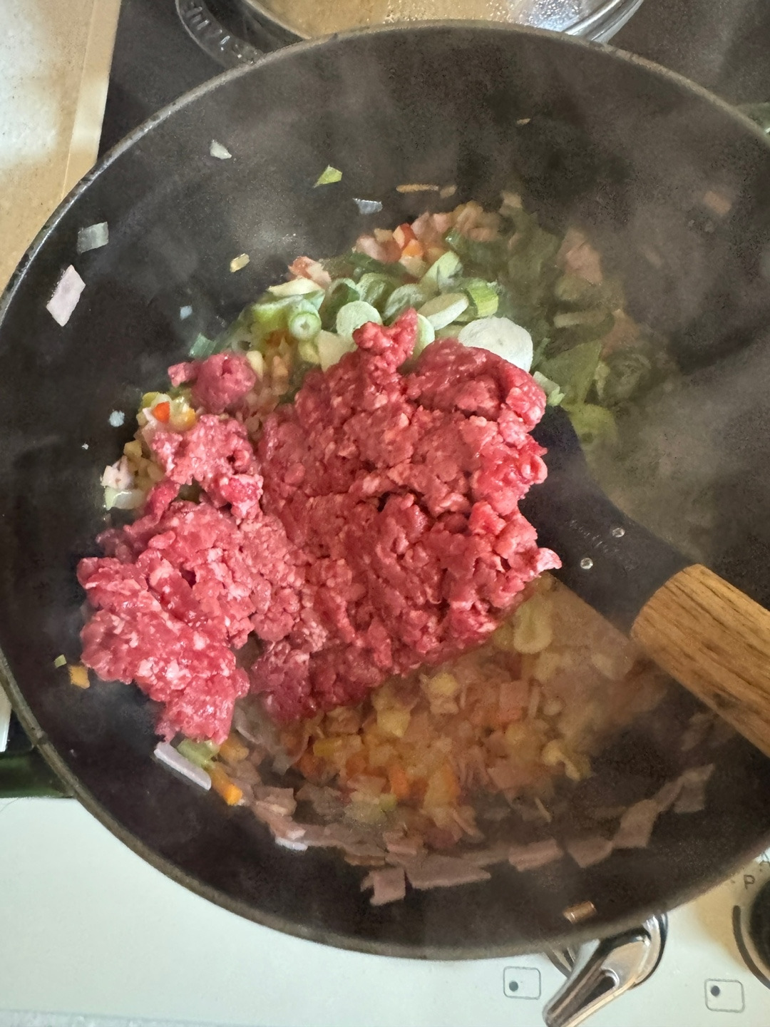 3. 야채가 어느 정도 익었으면 다짐육 소고기도 넣어 볶아준다.