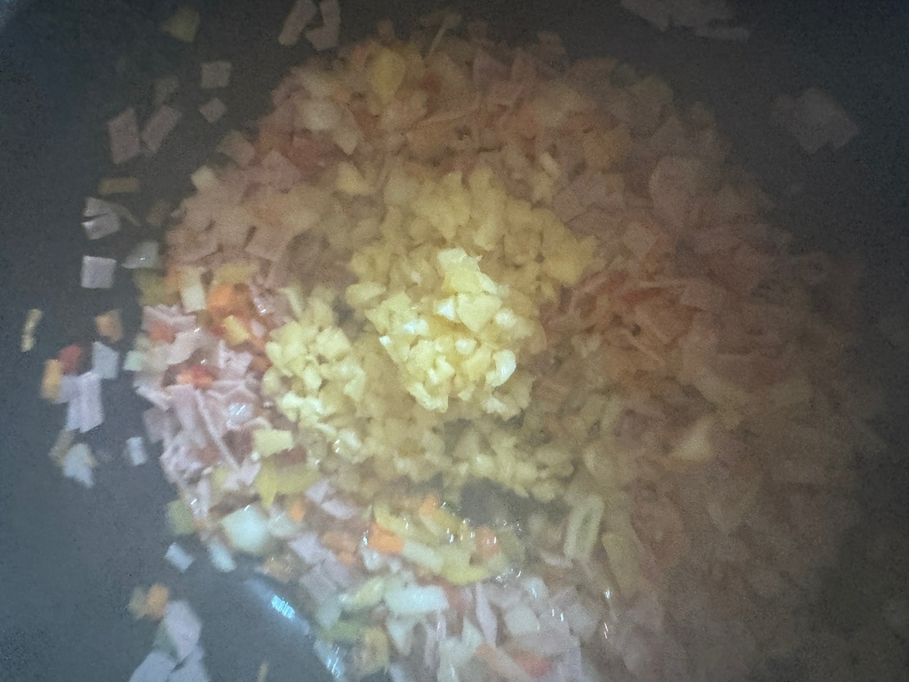 올리브유에 마늘, 양파 먼저 볶아주고 딱딱한 재료 순서대로 당근 샐러리 남은 야채들 그리고 베이컨을 차례로 넣어 볶아준다.