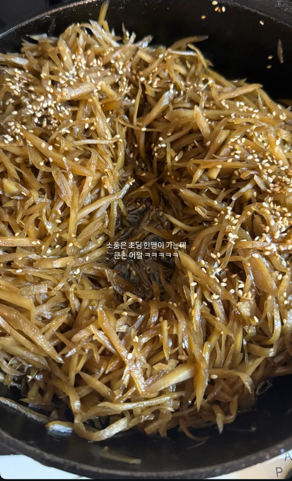 6. 김밥을 만들면서 한 팬으로 계속 사용하는 게 중요하기 때문에 당근까지 마치고 난 후에 어묵이 있으면 어묵을 볶는다. 어묵은 간장 1T, 물엿 1T를 함께 넣어 볶아줘야 하므로 마지막에(하지만 이날은 생략!)