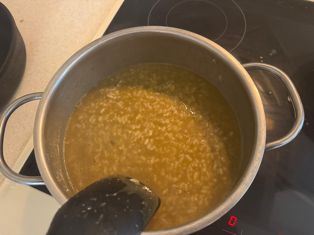 10. 쌀알이 흐물흐물하게 퍼지고 적당히 촉촉한 상태에 죽이 되면 완성입니다. 쌀이 계속 물을 머금기 때문에 물이 많은 것 같아도 금세 다시 사라져 버려요!