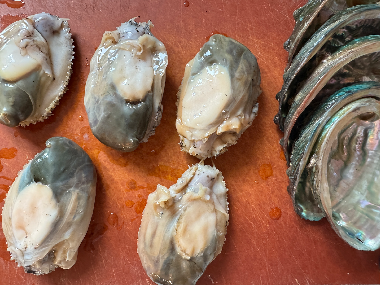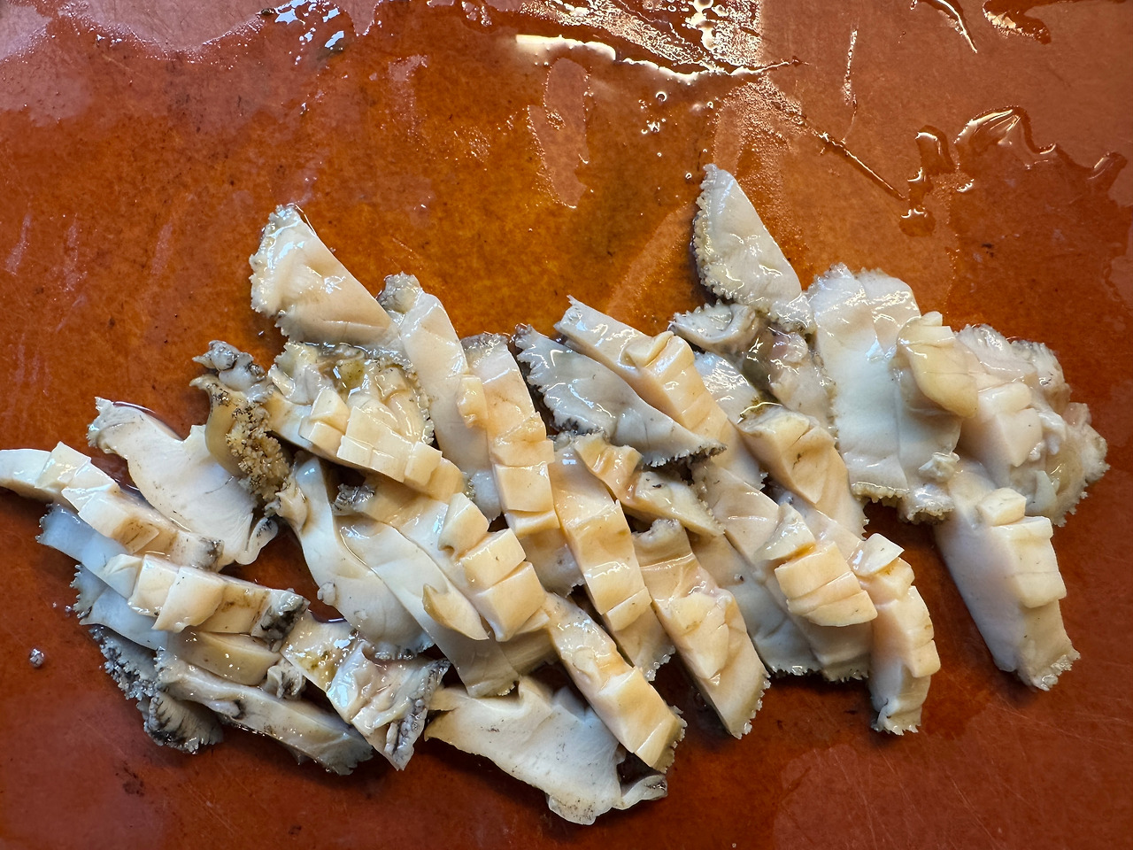 7. 전복을 볼록 나온 부분에 칼집을 한번 내어 한입 크기로 잘라주세요.