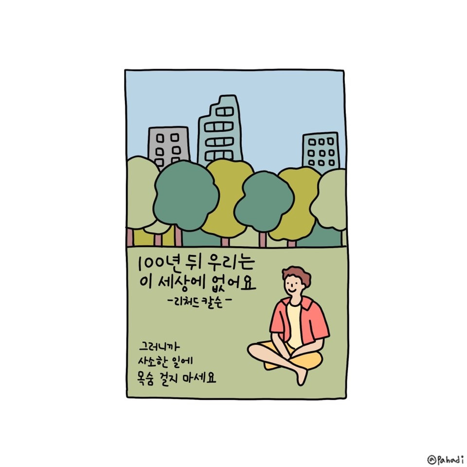 두 번째 책은 리처드 칼슨의 <100년 뒤 우리는 이 세상에 없어요>. 이 책에서 리처드 칼슨은 거듭 강조한다. 사소한 일에 목숨 걸지 말라고. 결국 모든 일은 사소한 일이라고.