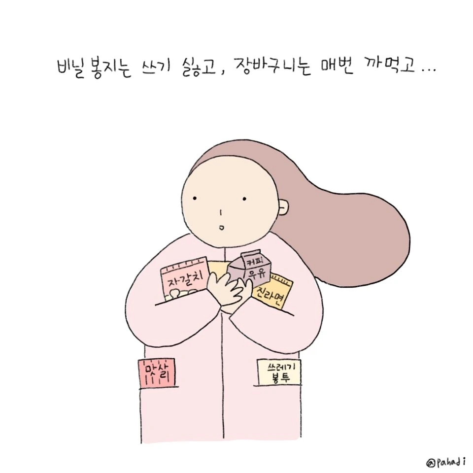 비닐봉지 사용은 줄여야겠고 장바구니는 매번 잊어버리니 몸이 고생입니다ㅎㅎ 그래도 비닐봉지는 웬만하면 안 쓰고 있어요. 생각난 김에 작은 가방 하니 주머니에 쏙 넣어두어야겠어요♡