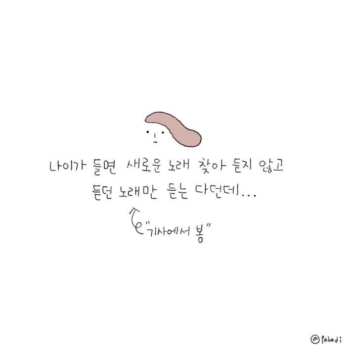 관심 없어진 지 오래. 가끔 흘러 듣는 새 노래가 취향저격일 때도 있지만 잠깐일 뿐이다. 오늘도 익숙한 가수의 이름을 검색하고 무작위 재생을 누른다. 숨 쉬는 공기만큼 익숙해진 멜로디. 새로움보다 익숙함으로 채워가는 하루. 이것도 꽤 행복하다.