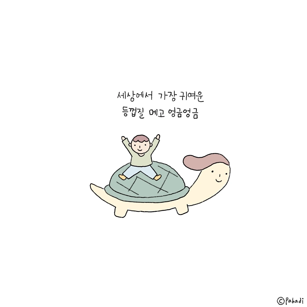 아이가 말한다. "엄마 꼭 거북이 같아." 아이는 우리가 진짜 거북이로 변신한 듯 신이 난 목소리다. 거북이가 느려도 얼마나 행복할지 상상해본다. 행복해지는 일이 사실 별게 아니다. 그 쉬운 걸 늘 아이 덕에 깨닫는다.