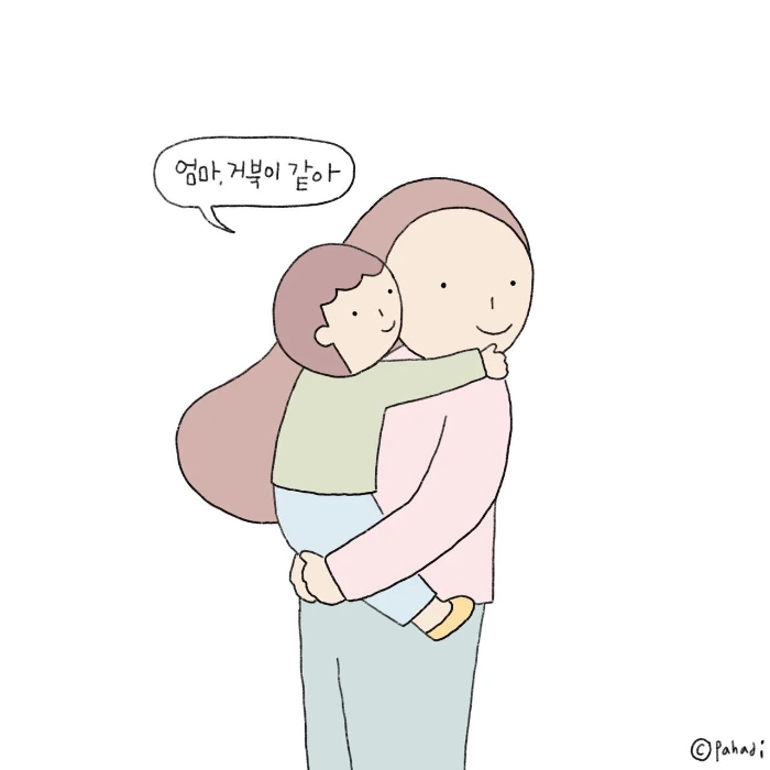 이제 꽤 무거워진 아이를 안는 대신 업는다. 길어진 팔로 내 목을 단단하게 감을 수 있어 안는 것보다 업는 게 편하다. 우리 엄마는 내가 꾀병을 부릴 때면 늘 모르는 척 등을 내어주셨다. 엄마 등에 업혀 따뜻한 심장 소리를 들으며 발을 살랑살랑 흔들면 구름 위에 둥둥 떠있는 것처럼 기분이 좋아졌다. 그런 기억을 아이에게도 주고 싶어 나도 아이를 자주 업어준다. 굳이 업어달라고 하지 않을 때도 "업어줄까?"라고 물으며 등을 내민다. 손바닥에 토실토실한 엉덩이가 포옥 닿는다. 등에 따뜻한 온기가 스민다. 묵직한 무게가 느껴진다. 이 무게마저 사랑스럽다. 이 순간을 기대하는 건 아이보다 오히려 나인 것 같다.
