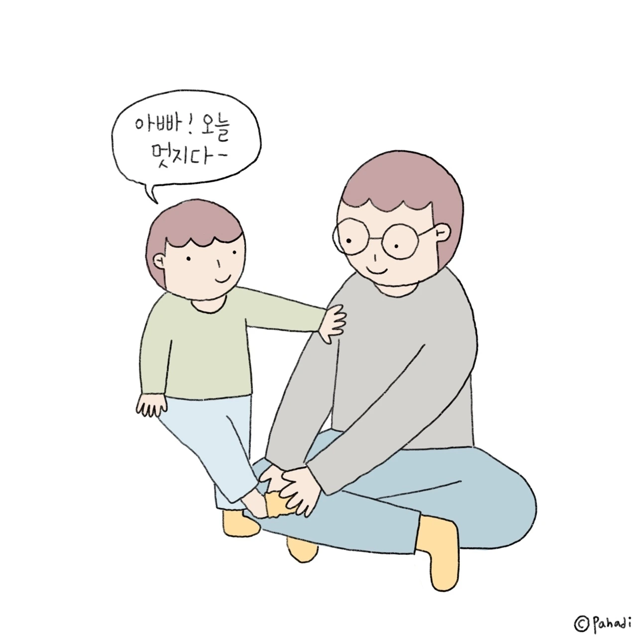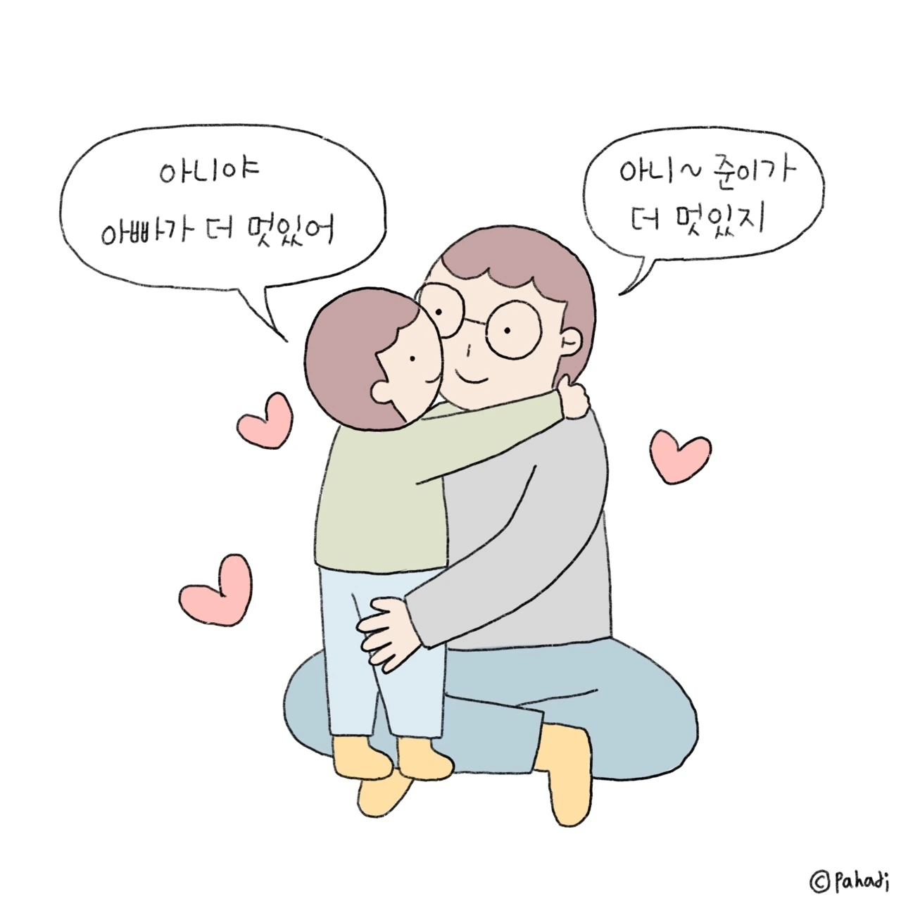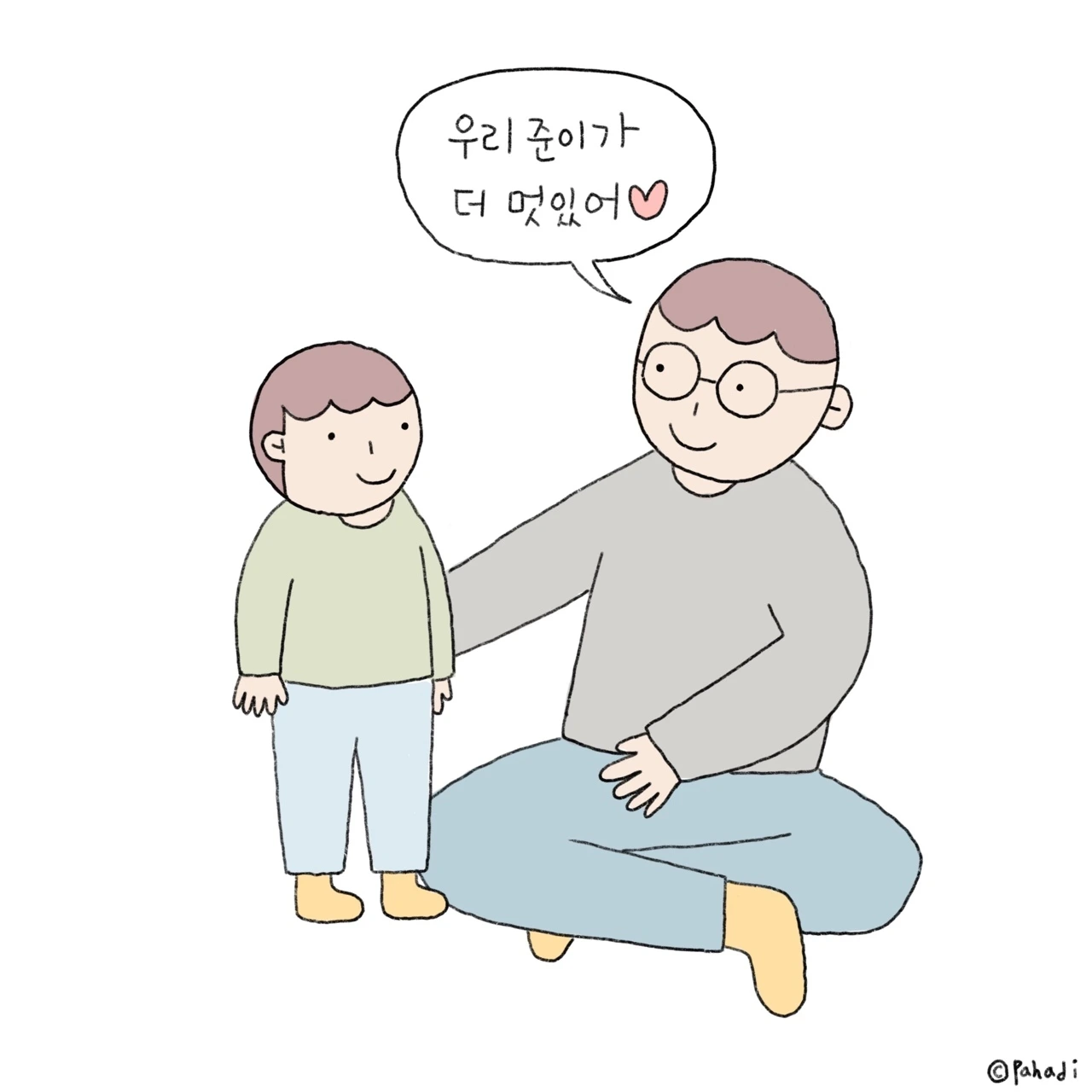 아이가 좋아하는 이 노래에서 착안하여 우리는 아이와 아빠를 얼굴 짝꿍이라고 부른다. 그만큼 또옥 닮았다. 유전자 검사는 돈 낭비, 시간 낭비일 뿐이다. 누가 봐도 똑같은 얼굴인 둘이 마주 보고 서로 멋지다고 칭찬을 쏟아낸다. 정말 눈꼴시다.