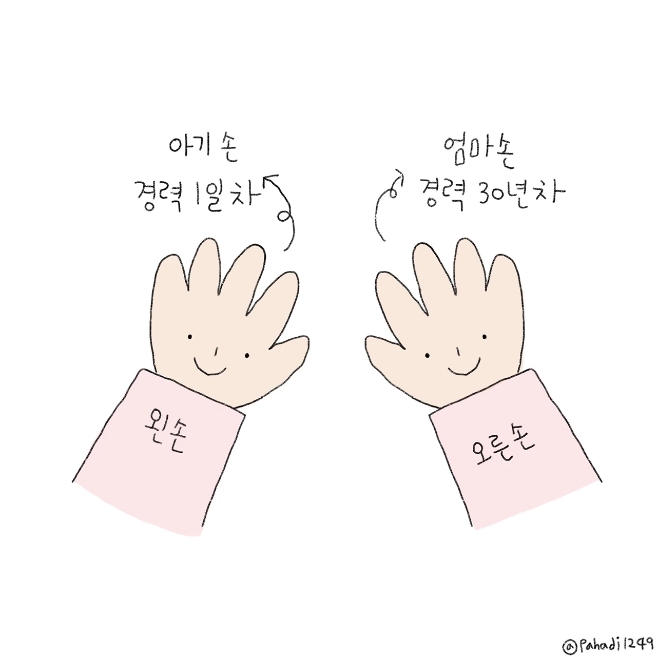 왼쪽보다 살짝 더 굵어진 오른손을 보니 너무 오른손을 혹사시켰나라는 생각이 든다. 평생 오른손잡이였던 나는 오른손으로 밥도 먹고 옷도 입고 글씨도 쓰고 이제 그림까지 그린다. 조금씩 오른쪽 손목과 어깨가 아픈 걸 보니 이제 슬슬 왼손에게 짐을 좀 나눠줘야 할 때인 것 같다.
