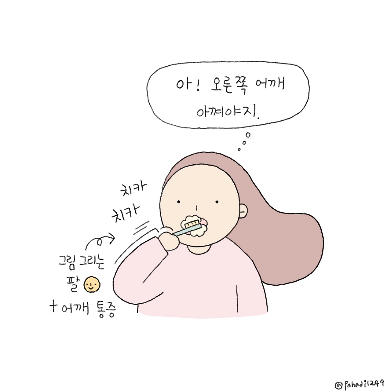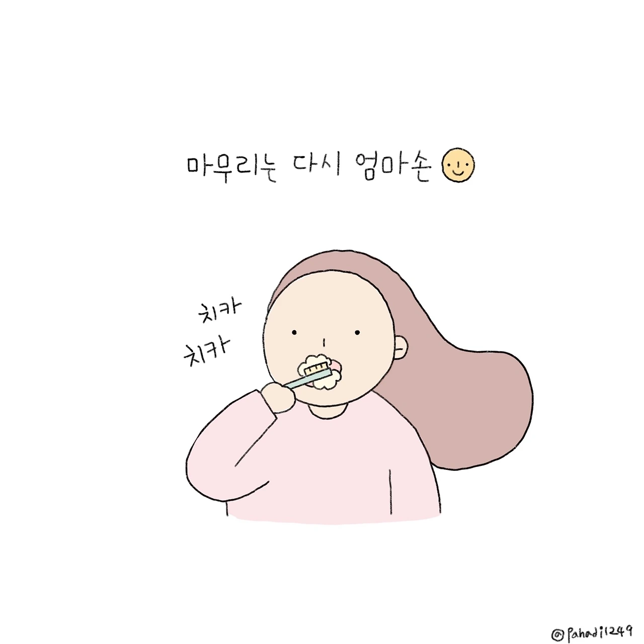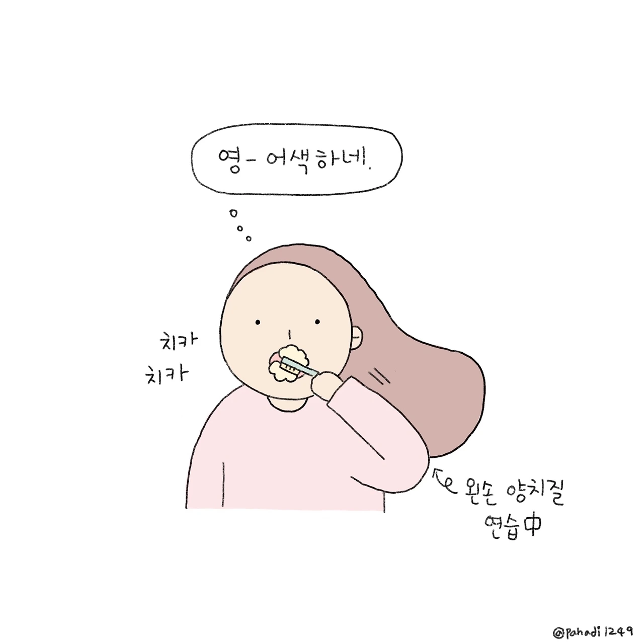 글을 쓰거나 그림을 그리는 영역은 워낙 전문분야이니 양치질부터 도전이다. 쓱쓱 싹싹 부지런히 움직이기는 하는데 영 개운치가 않다. 양치질에서도 쌓아온 경력을 무시할 수는 없나 보다. 끝내 다시 오른손에 칫솔을 넘기고 양치질을 마쳤다. 경력 1일 차 왼손에게 너무 많은 걸 바라지 말아야지. 내년쯤은 좀 능숙해질까ㅎㅎ