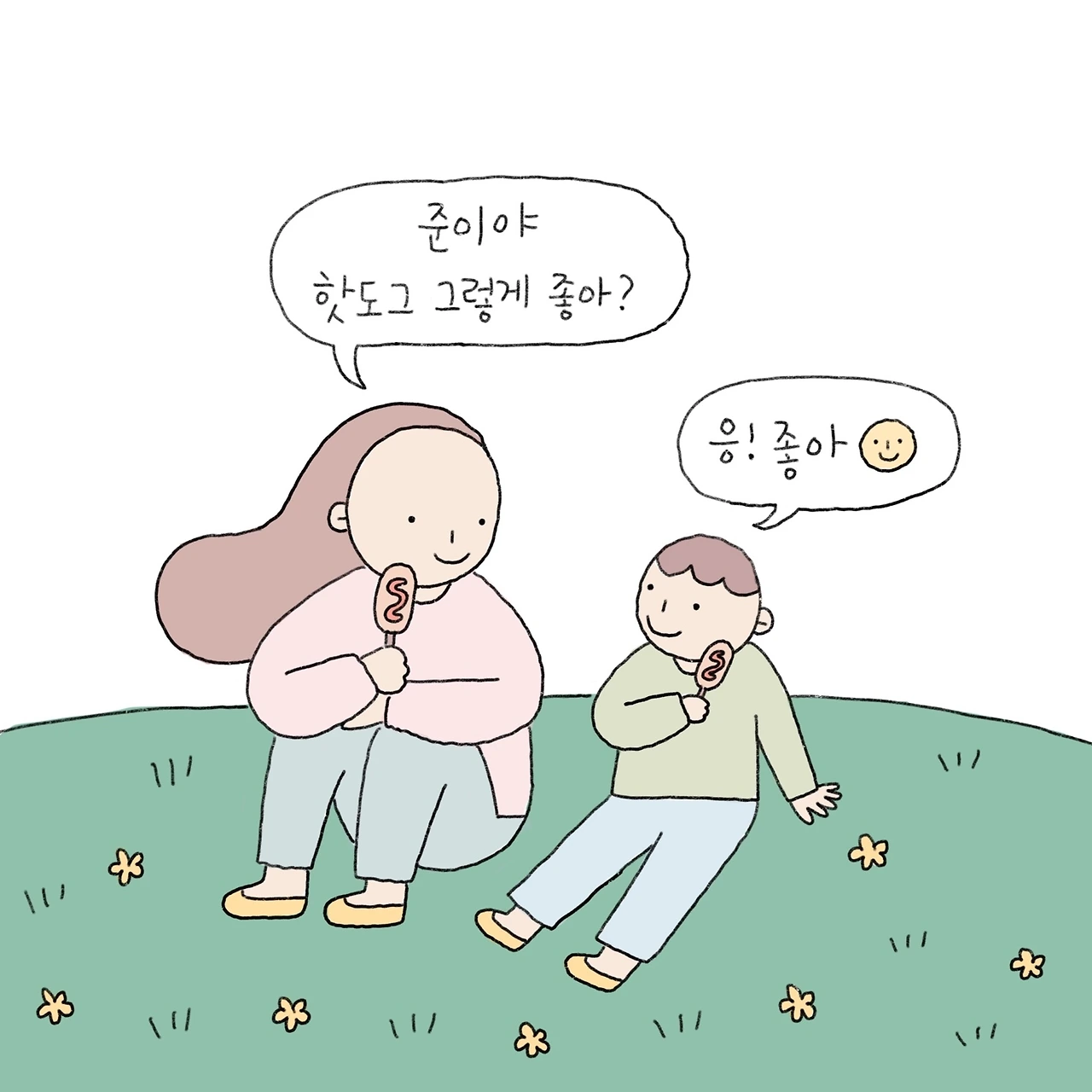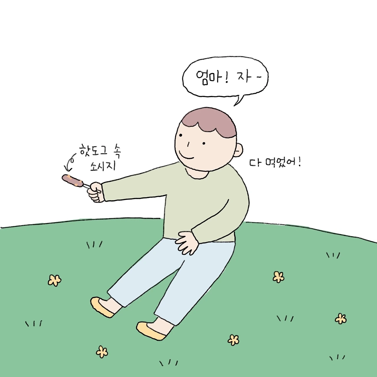 하지만 준이가 해맑게 건네는 음식에는 당해낼 재간이 없다. 준이가 치즈 핫도그를 맛있게 먹어서 이번에는 큰 마음먹고 소시지 핫도그를 사줬다. 좋아하는 케첩이 발라진 핫도그를 든 엄마를 보는 표정이 흡사 산타할아버지라도 본 것같다. 이 맛에 자꾸 맛있는 걸 주고 싶어진다.