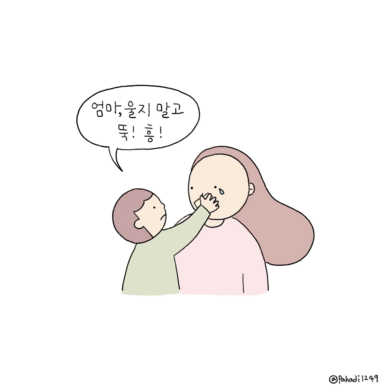 어느새 아이가 휴지 한 칸을 떼어와 눈물을 닦아준다. "엄마, 흥! 해! 흥!" 어디서 배운 건지 정성껏 콧물도 닦아준다. "엄마 울지 말고 뚝. 흥!" 하며 어깨도 토닥여 준다. 아이들이 울 때면 어린이집 선생님께서 이렇게 해주시나 보다.