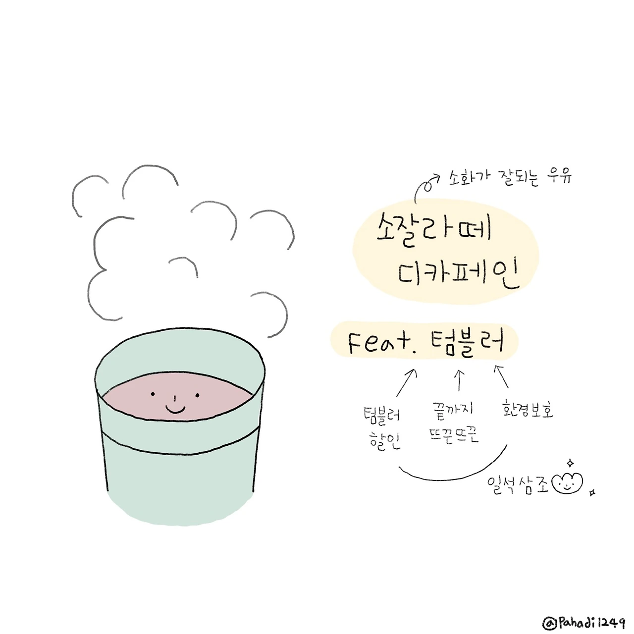 갈수록 커피가 안 받는다. 카페인에 민감해져 잠을 설치고 카페라테를 마시면 우유 때문에 속이 더부룩하다. 하지만 나의 하루에 커피를 빼면 어떤 즐거움이 남나. 커피만큼은 절대 포기할 수 없다! 방법을 찾아보자. 디카페인 커피가 맛있는 카페를 찾고 우유 대신 소화가 잘되는 우유를 선택한다. 귀리 우유로 만든 카페라테도 도전! (이건 적응 시간이 좀 더 필요할 것 같다.) 좋아하는 것들을 포기할 필요는 없다. 상황에 따라 조금의 변화가 필요할 뿐.